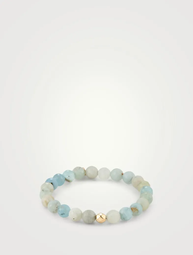 Faceted aquamarine beads are strung together and fastened accented with a ball charm on a stretchy cord.