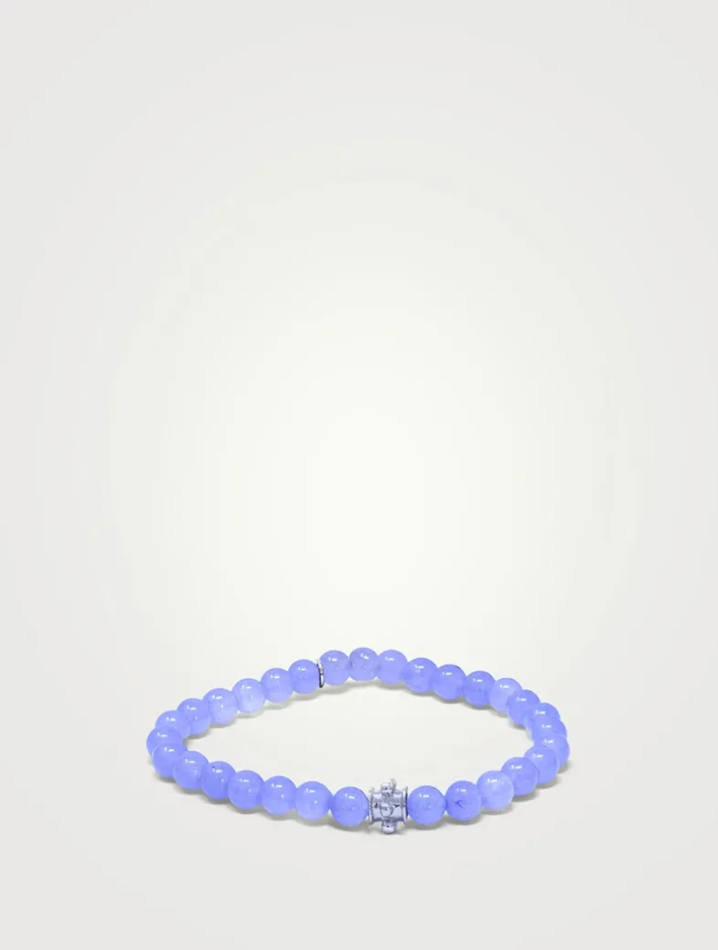 Violet jade rondelles are strung together with an Anzie signature Dew Drop barrel in sterling silver. Mounted on a stretch cord, this bohemian bracelet is comfortable to wear.