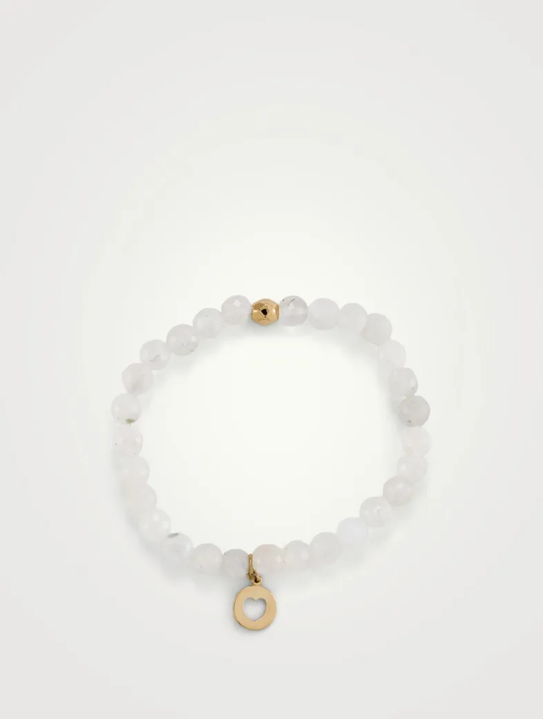 Faceted moonstone beads are strung together and fastened accented with a heart charm on a stretchy cord.