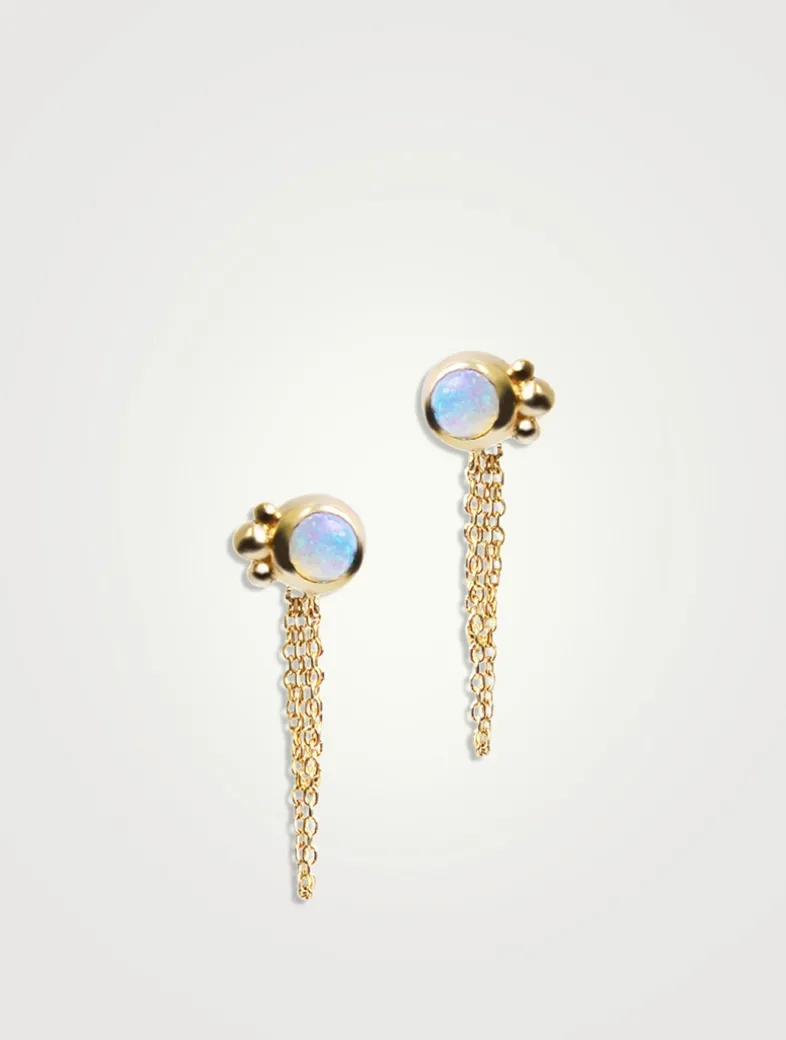 Inspired by both Southwestern and Art Deco influences, the Aztec collection showcases spikes, trillion-cut gemstones and starburst motifs. Nestled in polished Dew Drop settings, these earrings showcase Australian opals. Diamond-cut chains connect the stud to the butterfly back.