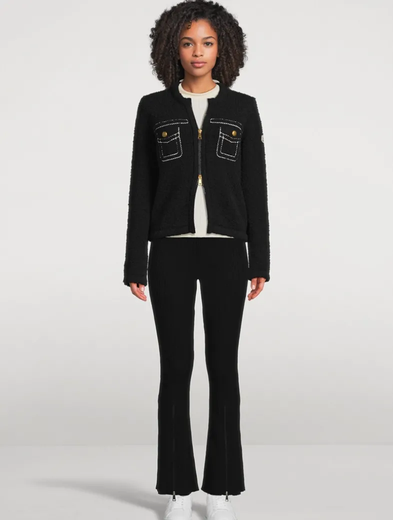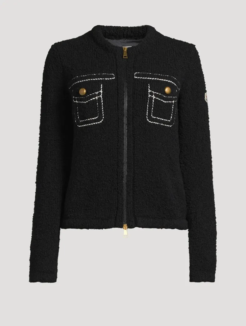 A soft bouclé finish lends a textured touch to this zip-front cardi. It is filled with down for added warmth and embellished with contrast stitching highlighting the pockets.