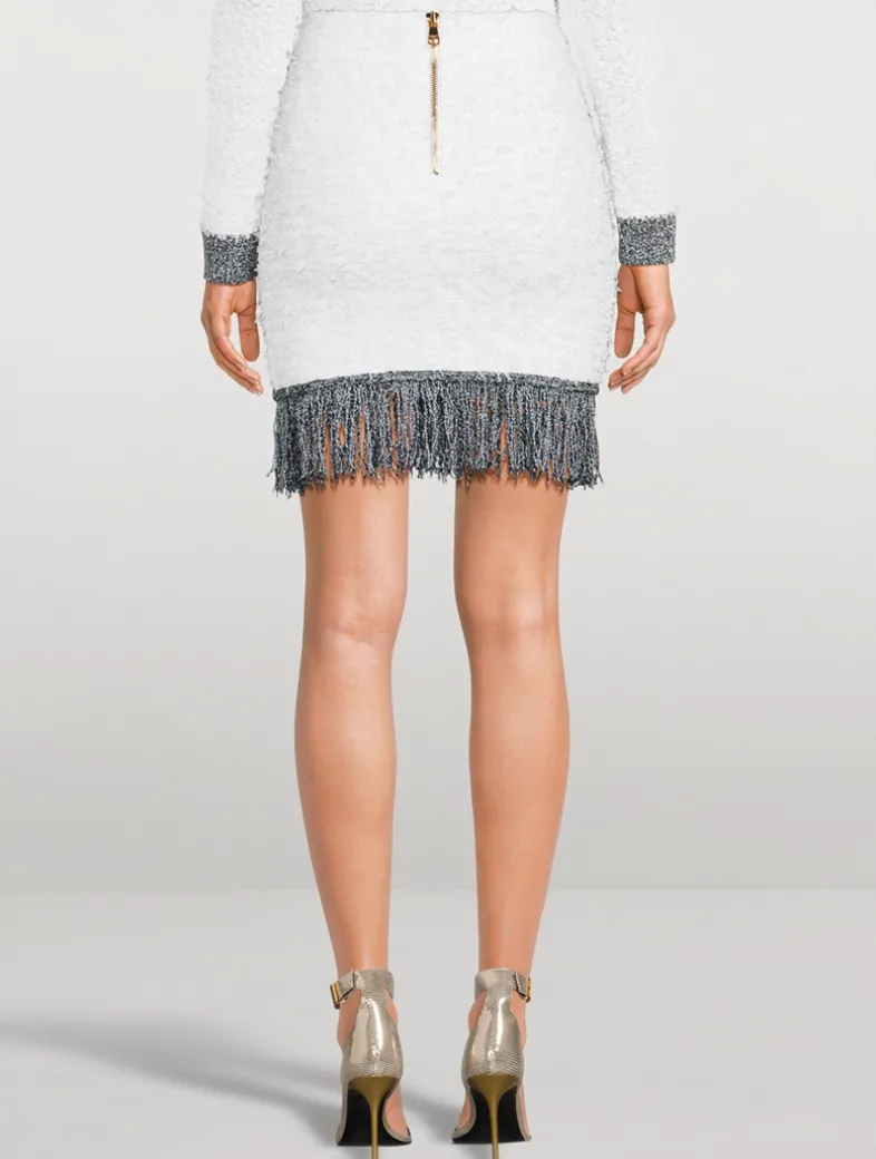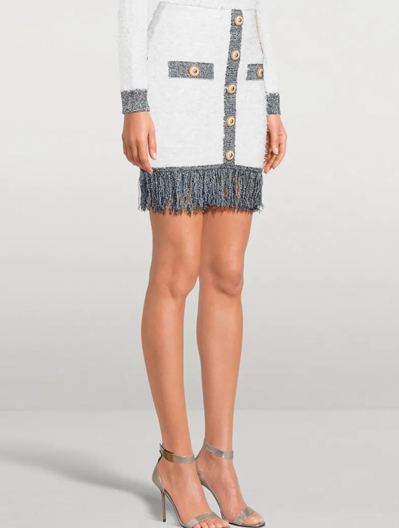 Made in France, this mini is knit with a textured bouclé finish. It has contrast detailing at the placket and pockets to match the fringed trim at the hem. Embellished with embossed buttons.