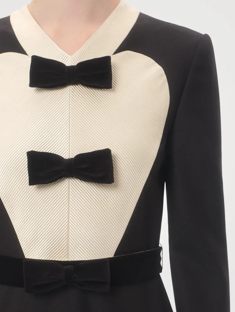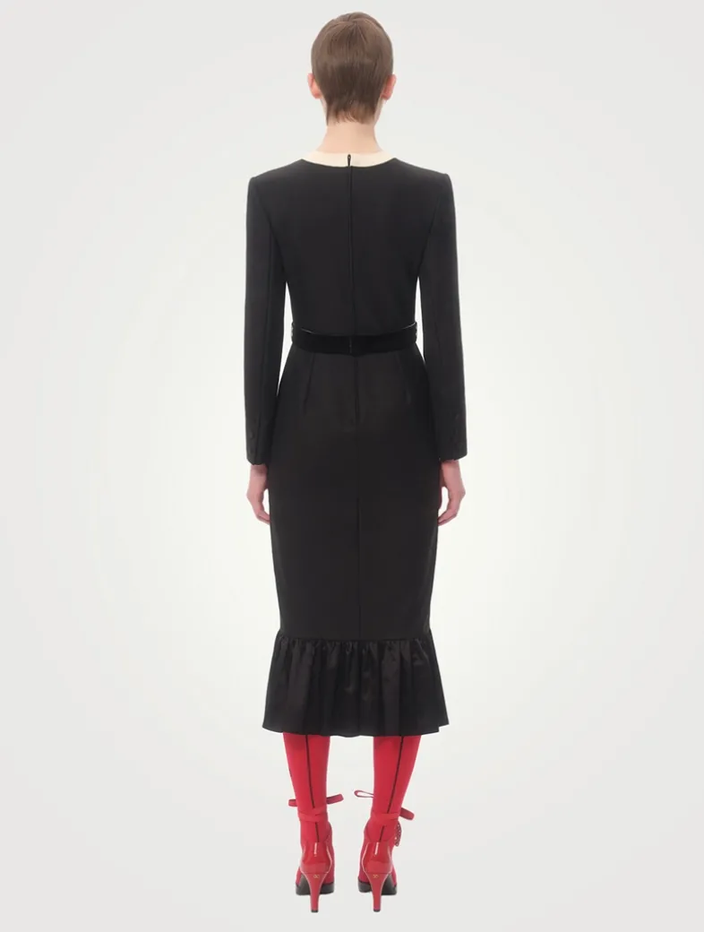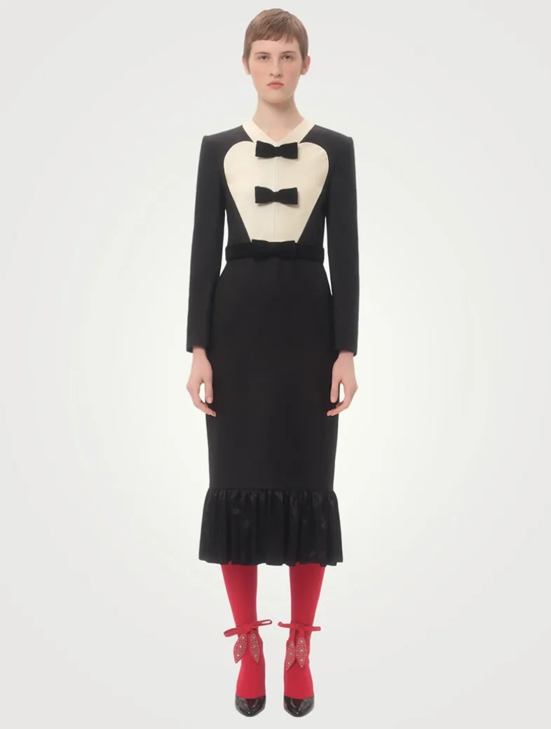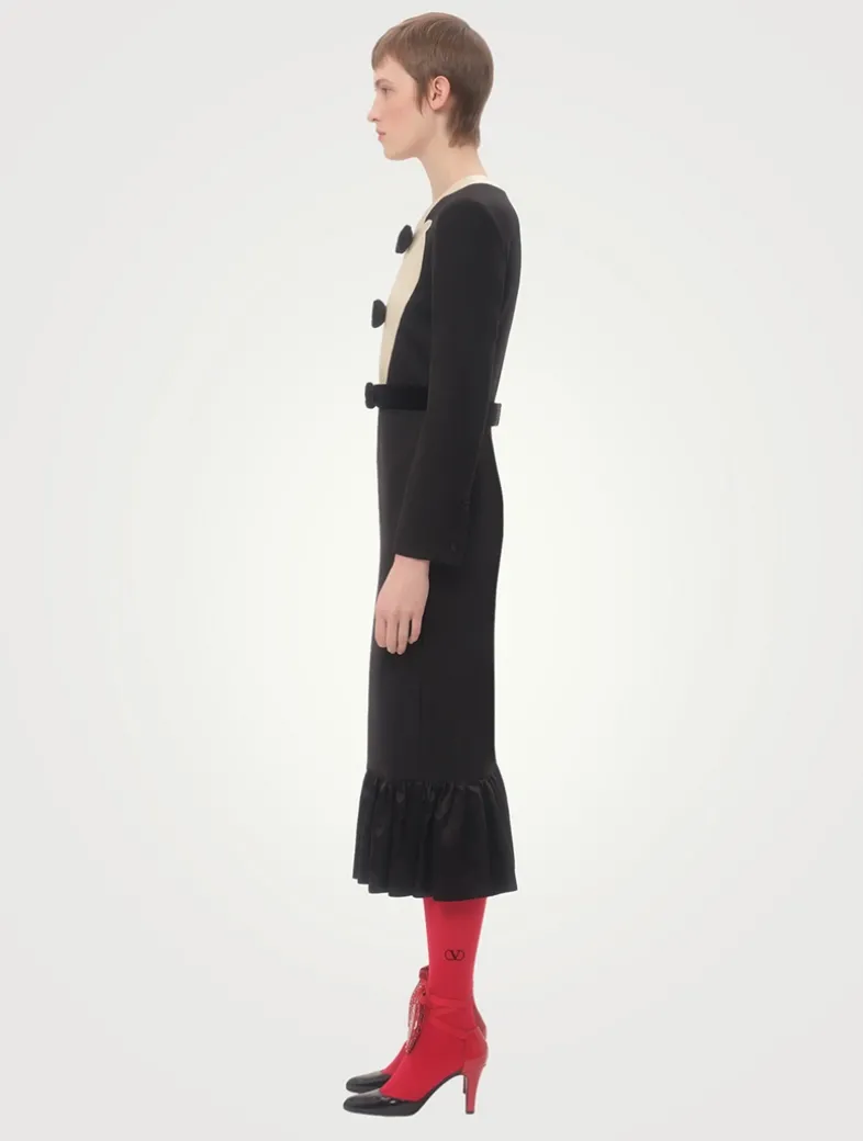 This graphic midi dress is designed with Ottoman plastron detailed with velvet bows at the front and a matching velvet waistband. It is crafted from virgin wool with a stretch-silk lining and ruffled hem.