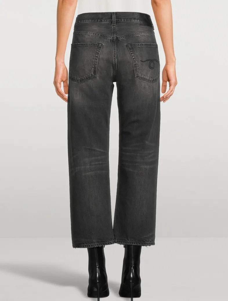 These classic boyfriend jeans are made from rigid Italian black on black denim and a mildly worn dark black wash with mild abrasions and a hand cut, uneven hem.
