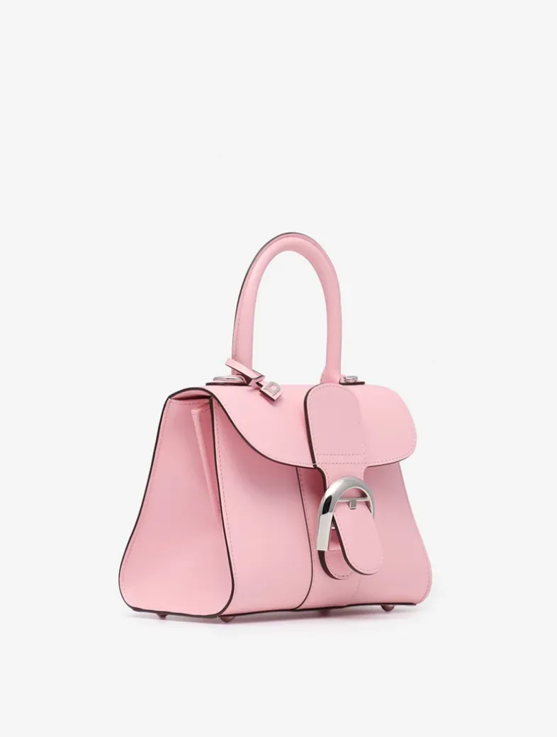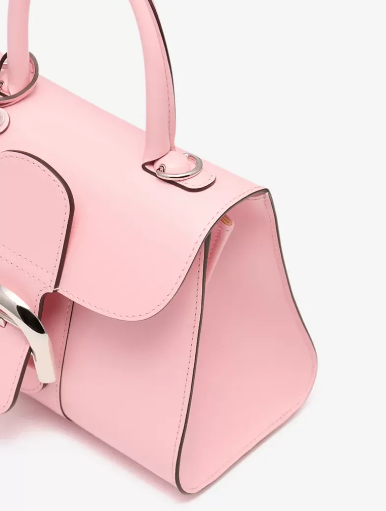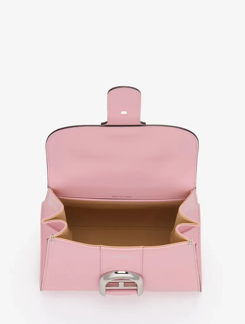 Top handle bag in Box Calf leather with signature horseshoe-shaped buckle in silver metal hardware. Features an adjustable, removable shoulder strap. Crafted in Bloom, a tender pink for Fall-Winter 2023.