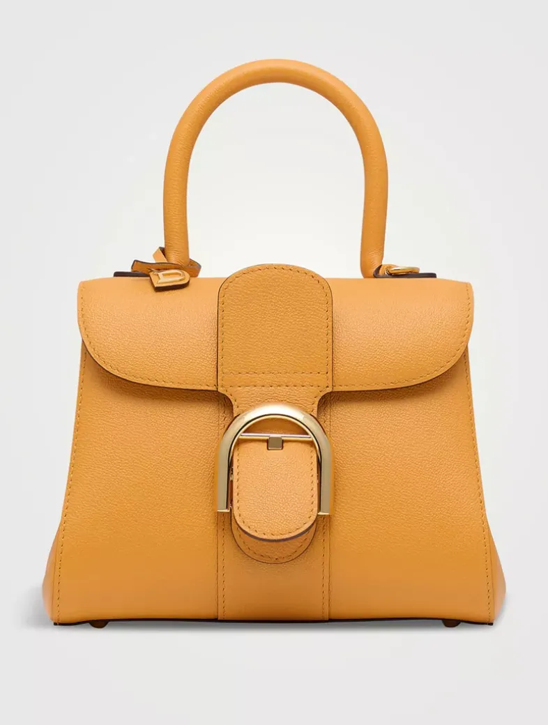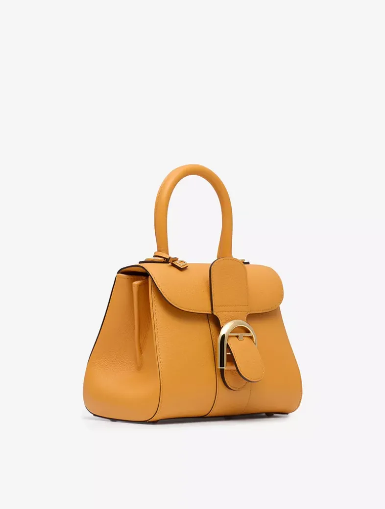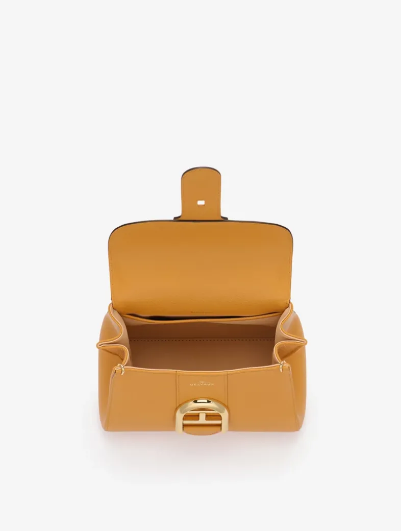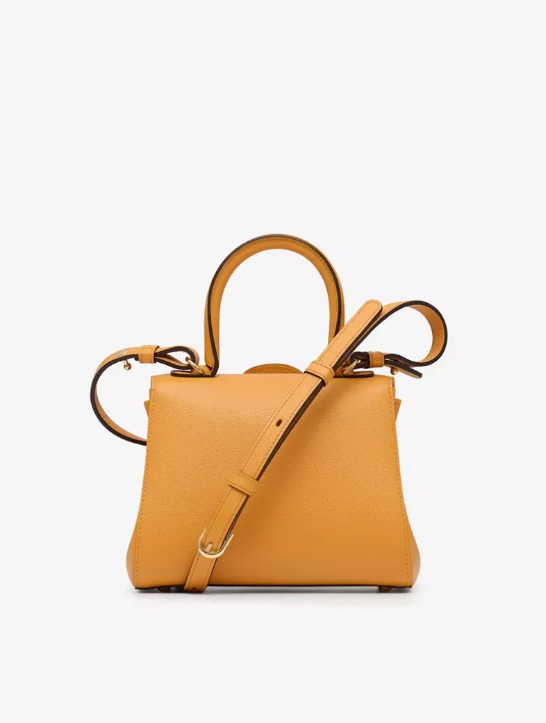 Top handle bag in Rodéo Calf leather with signature horseshoe-shaped buckle in gold metal hardware. Features an adjustable, removable shoulder strap. Crafted in Honey, a gourmand yellow for Fall-Winter 2023.
