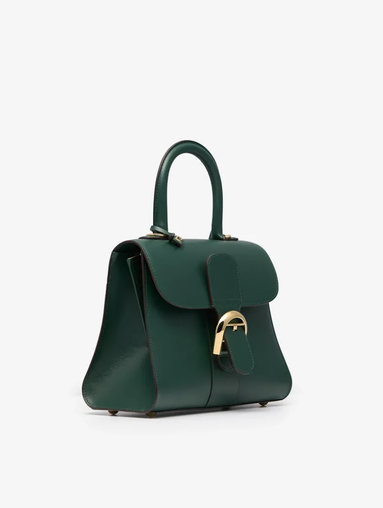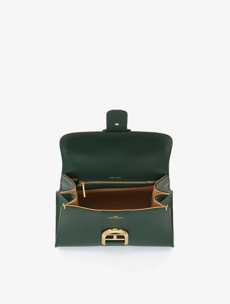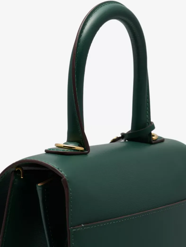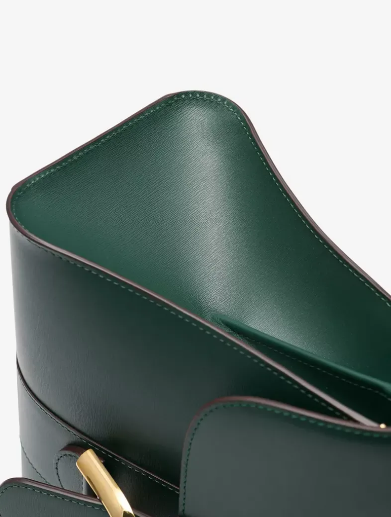 Top handle bag in Box Calf leather with signature horseshoe-shaped buckle in gold metal hardware. Features an adjustable, removable shoulder strap. Crafted in Forest, a crisp, dark green.