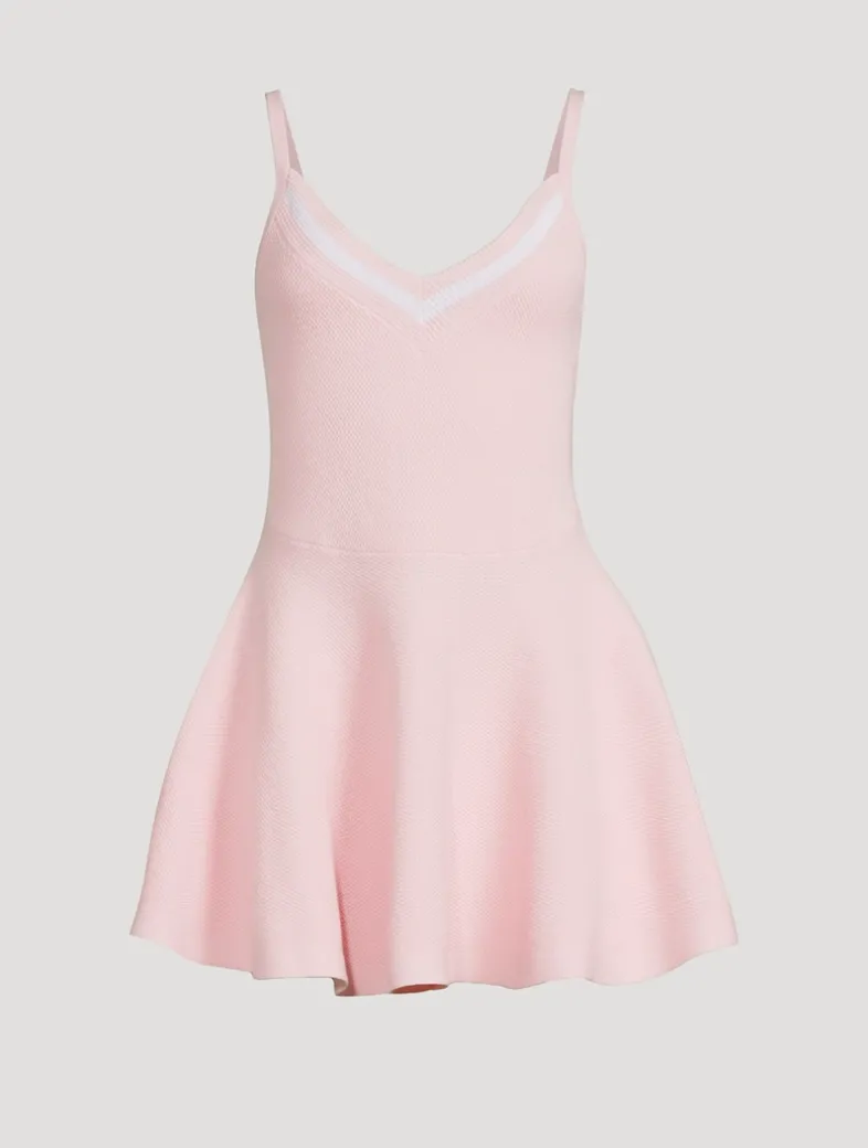 Nodding to tennis-inspired styles, this mini dress has a V-neckline framed by slim straps and a fitted bodice that falls to a flared skirt. Crafted from a cotton knit, it is edged with striped trim at the bust.
