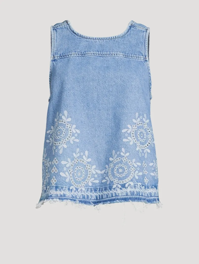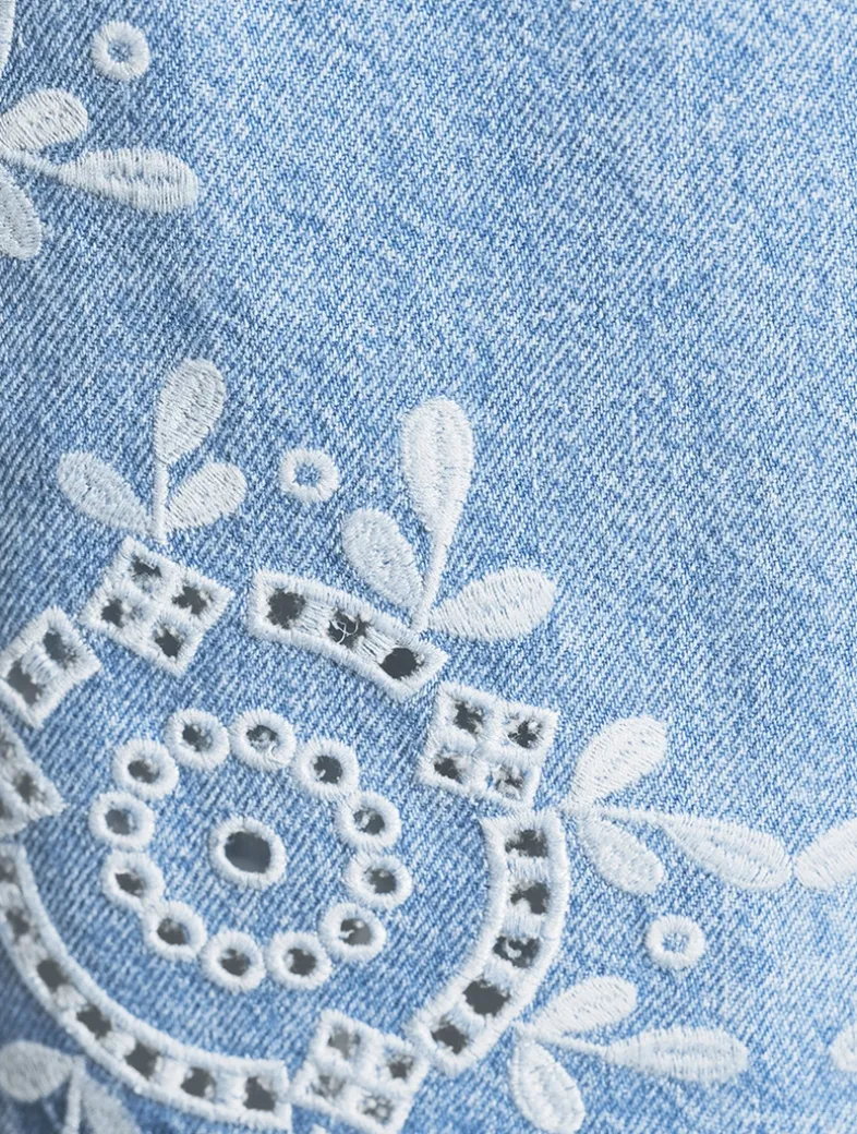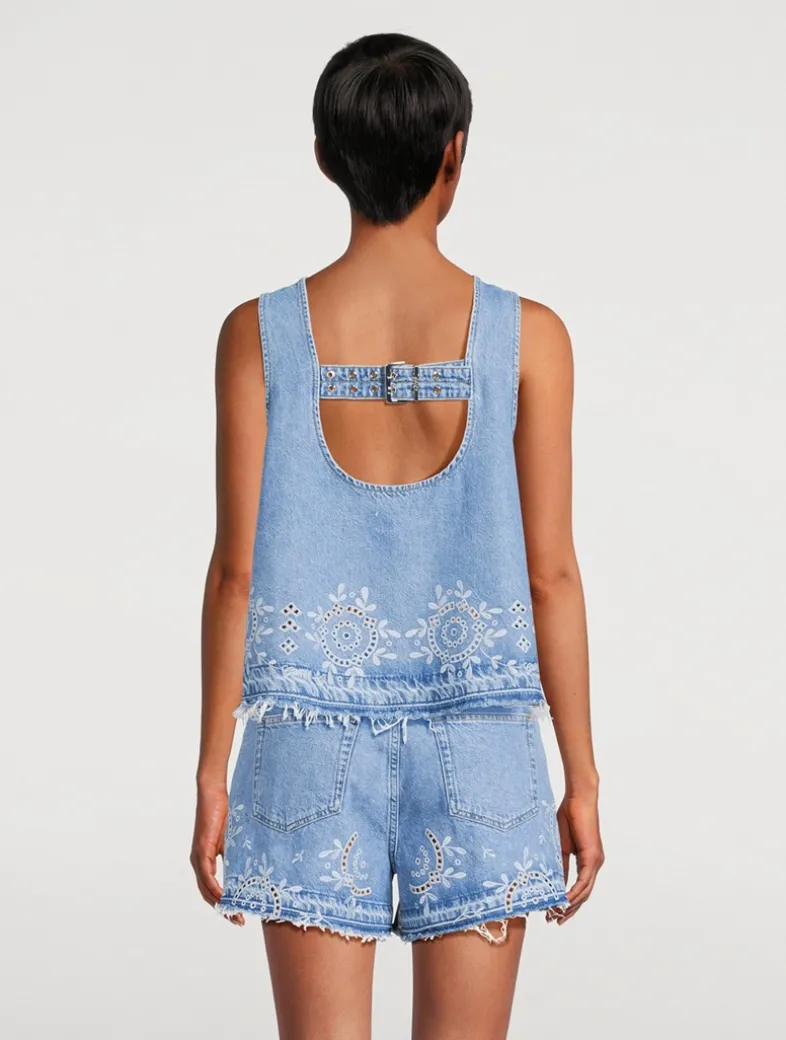 Embellished with delicate broderie Anglaise embroidered detailing, this denim blouse features a cut-out at the back finished with an adjustable buckled strap.