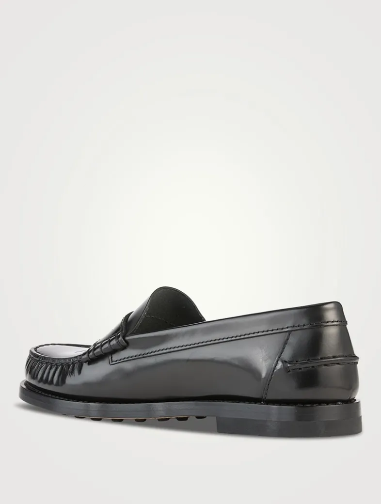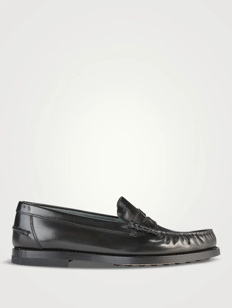 Loafers in brushed calfskin leather with penny bar and stamped Tod’s monogram. Characterized by a slightly gathered toe, they come with a leather outsole with rubber injection.