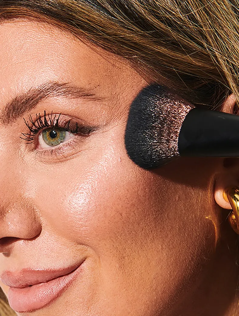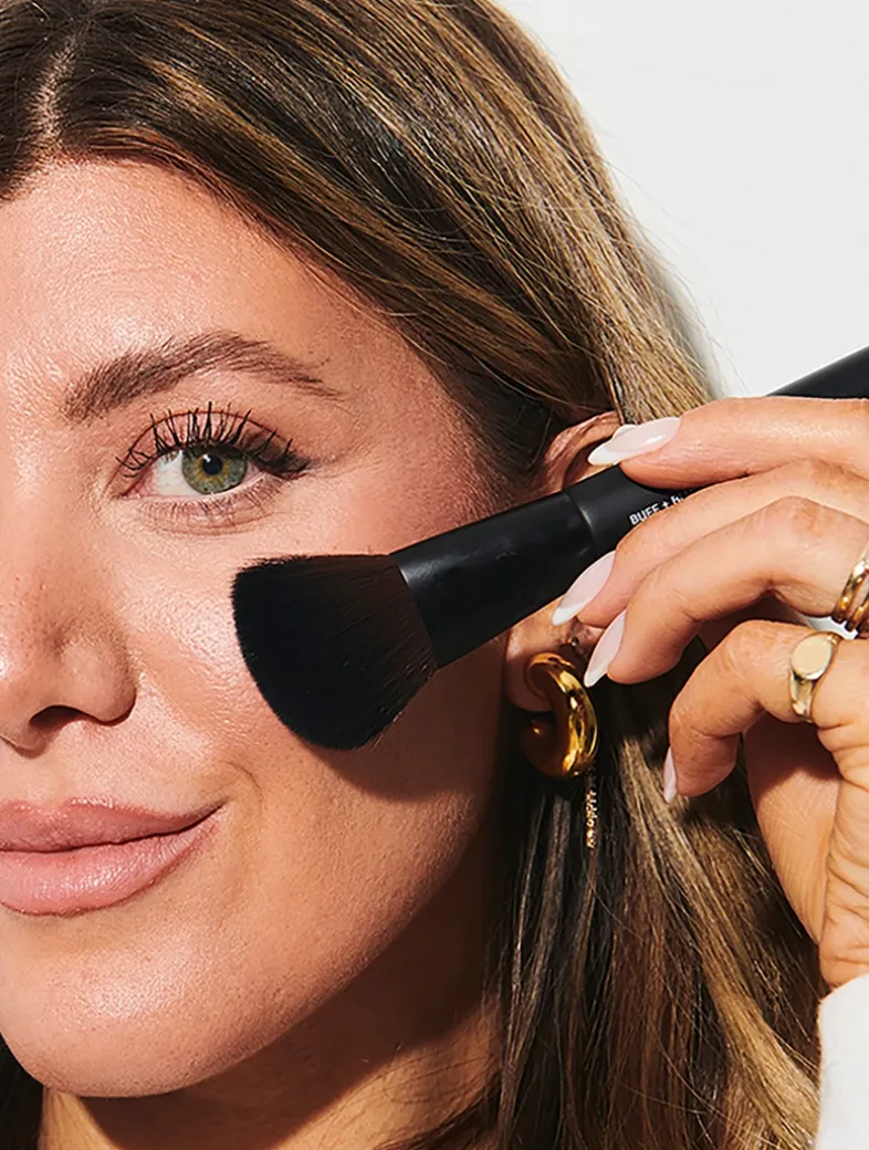 A dual-ended brush designed to diffuse face powder and blend cream or powder blush anywhere over the skin.