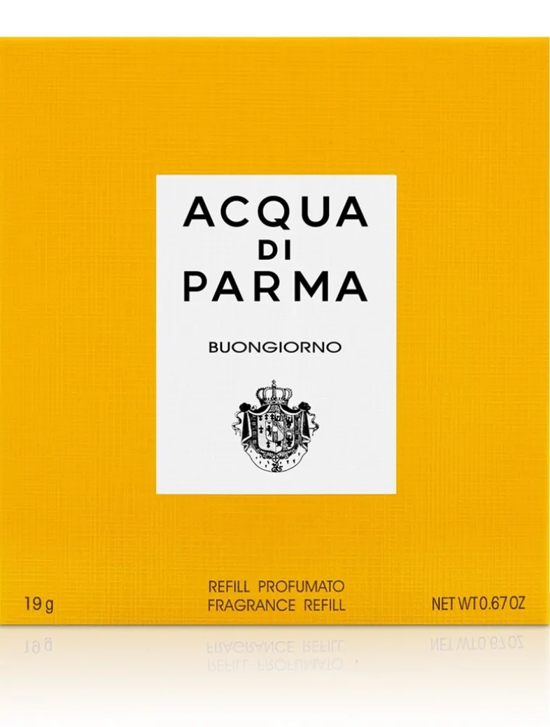 This Fragrance Refill is compatible with Smart Home Diffuser and Car Diffuser of ACQUA DI PARMA’s Airound collection. Diffused lingering scents for a sensuous yet fresh awakening to your day. As the first rays of the morning light filters through the window, the accompanying breeze brings hints of green aromas reminiscent of the splendid Italian countryside. The scents of freshly cut grass and sun-dried linen bring an infusion of freshness and softness at the same time. Natural wood tones are softened by moss, lending warmth, roundness and comfort to the fragrance.