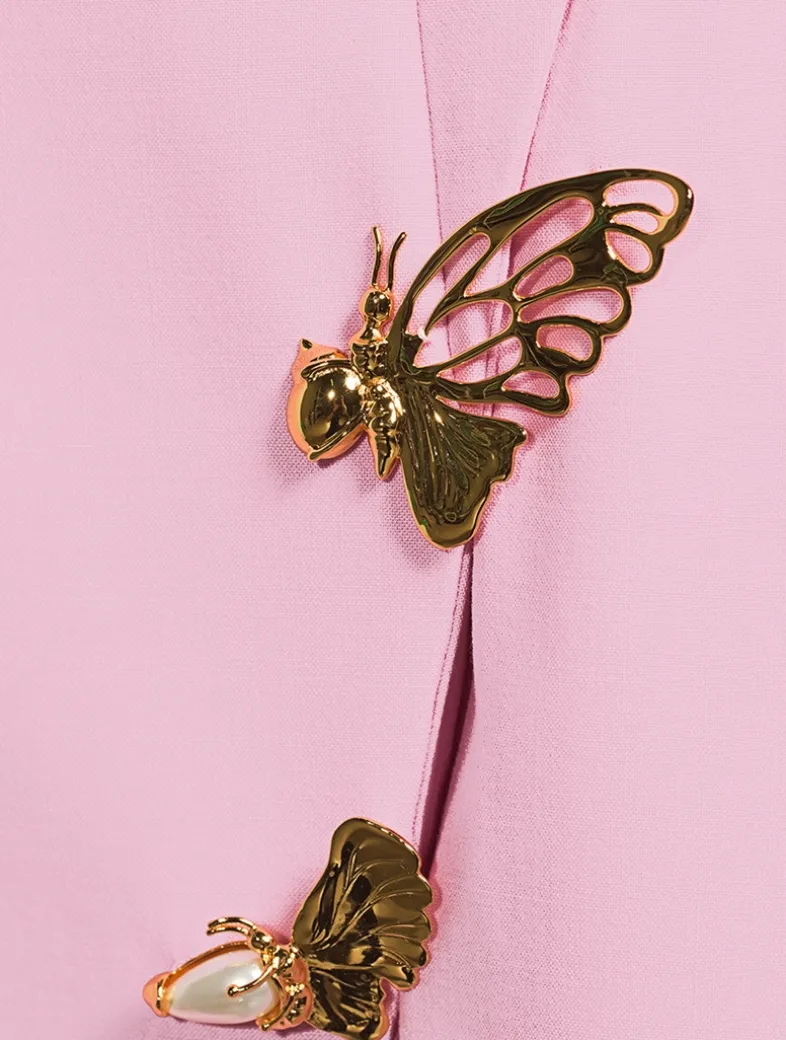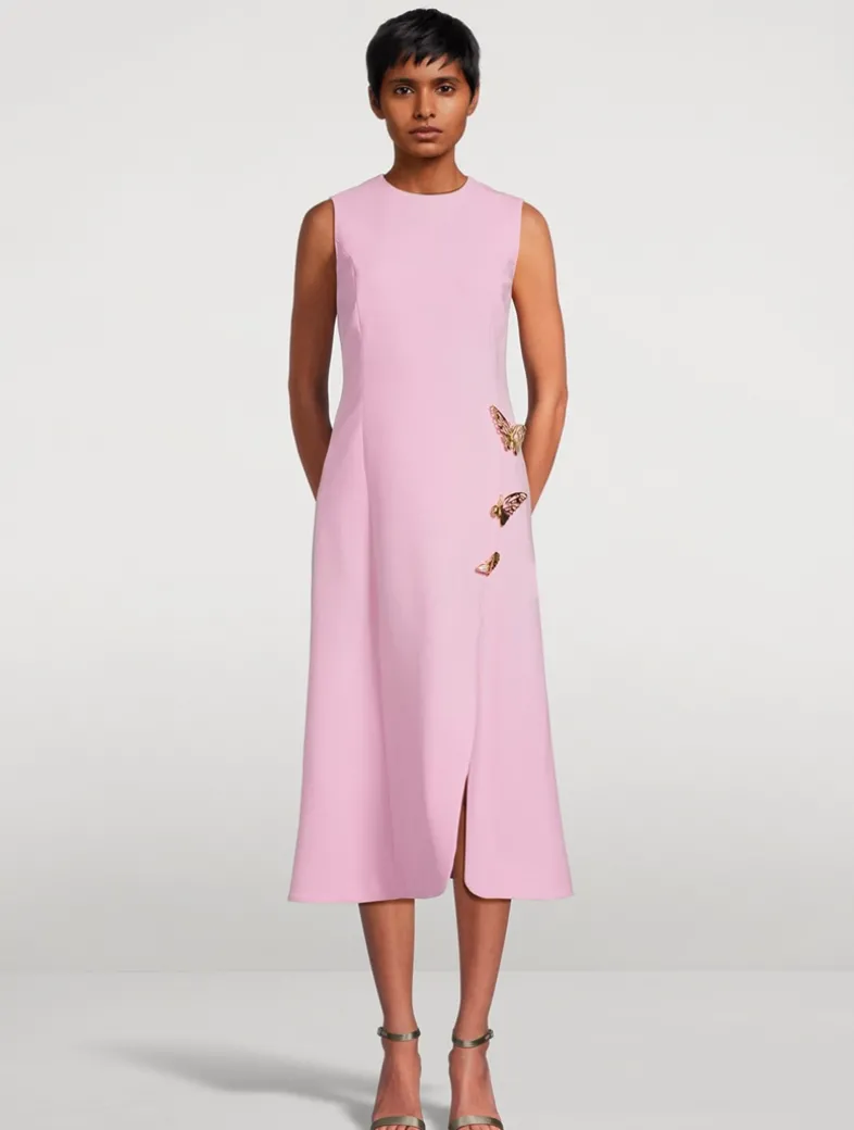 Cut from double-faced stretch wool, this refined dress is elevated by a daring split skirt adorned with gold-tone butterfly accents along the slit—each poised as if about to take flight.