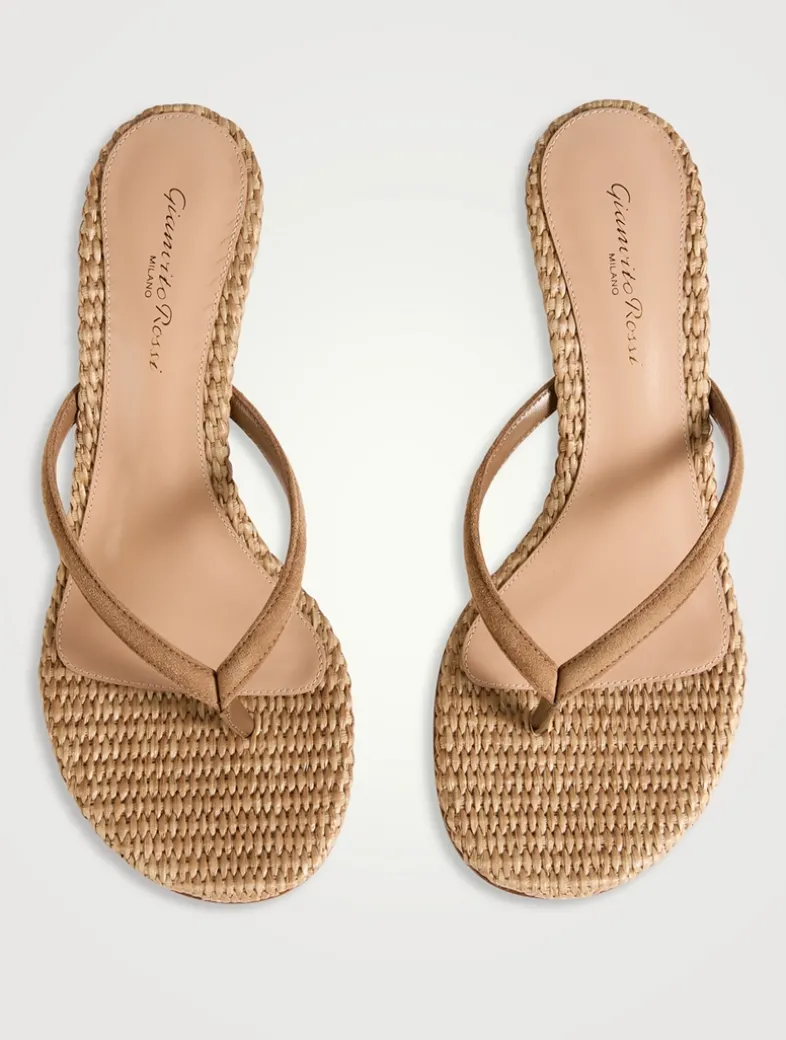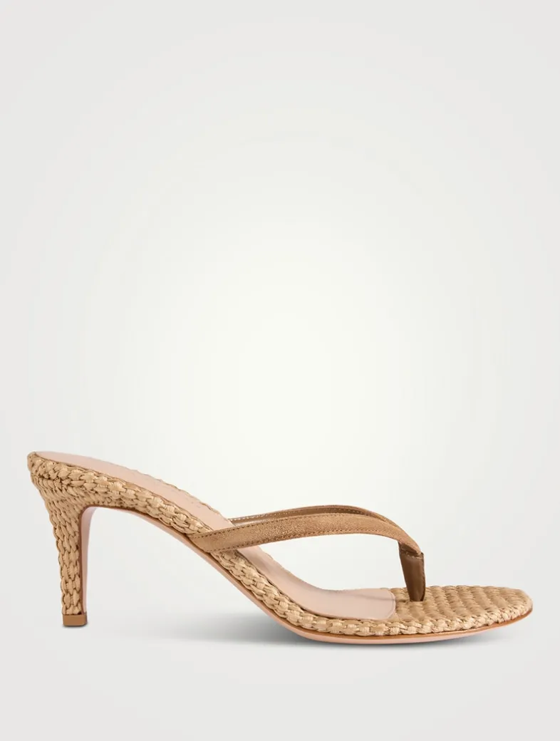Crafted from suede and woven raffia, Calypso is a round-toe thong sandal with padded straps and a 70mm stiletto heel. Handmade in Italy.