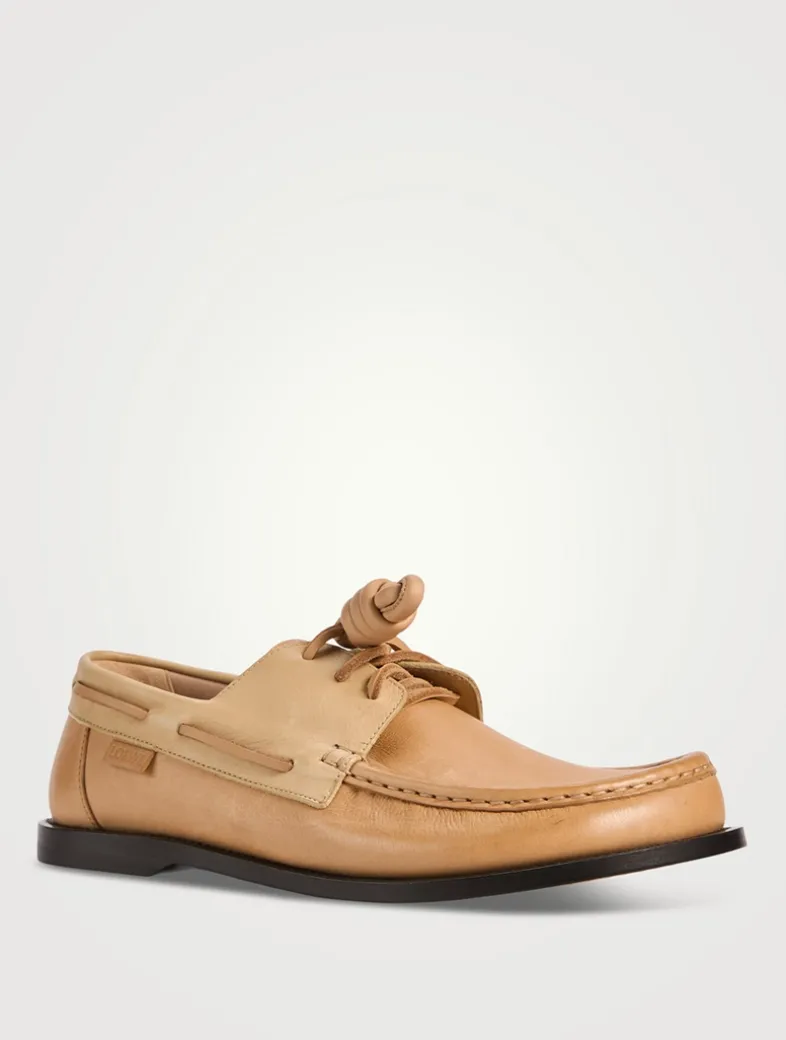 These boat shoes in two-tone soft calfskin feature the LOEWE signature round-toe shape and a hand-sewn construction with a supple leather lining and flexible sole. They have a squared leather lace closure, rubber-injected leather outsole, and LOEWE-embossed tag placed at the side.