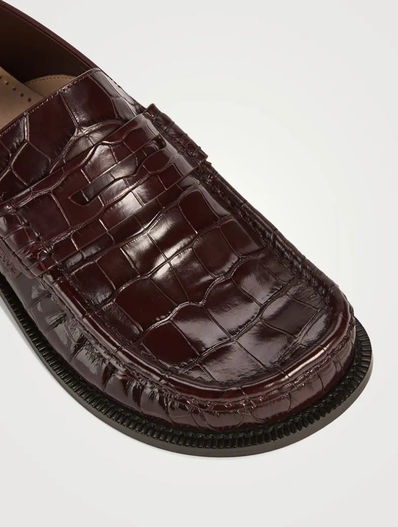 A modern take on a timeless style, these loafers are crafted in a mix of croco leather and smooth leather. Featuring the Loewe signature round toe shape, penny bar, and a collapsible heel. Finished with an extra padded leather insole for added comfort.