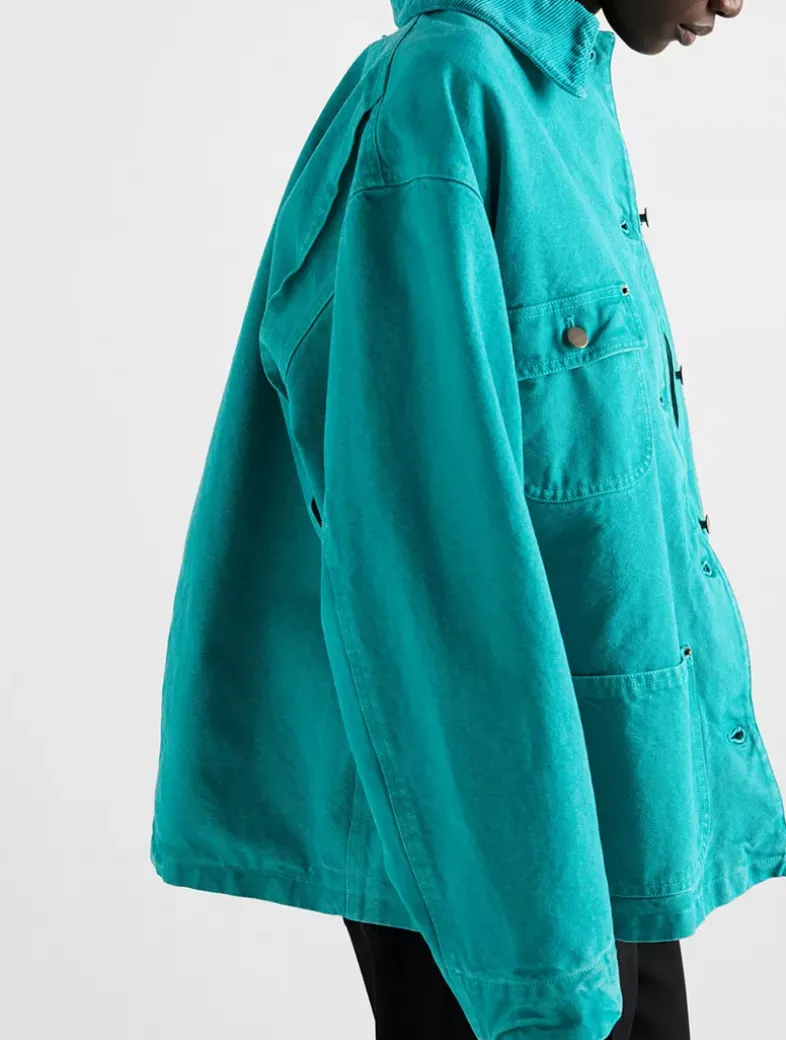 Unlined Velvet collar Long sleeves Button closure Patch pockets Leather triangle logo Matching stitching Length cm 72, Size: 38 Dyed and treated canvas garment