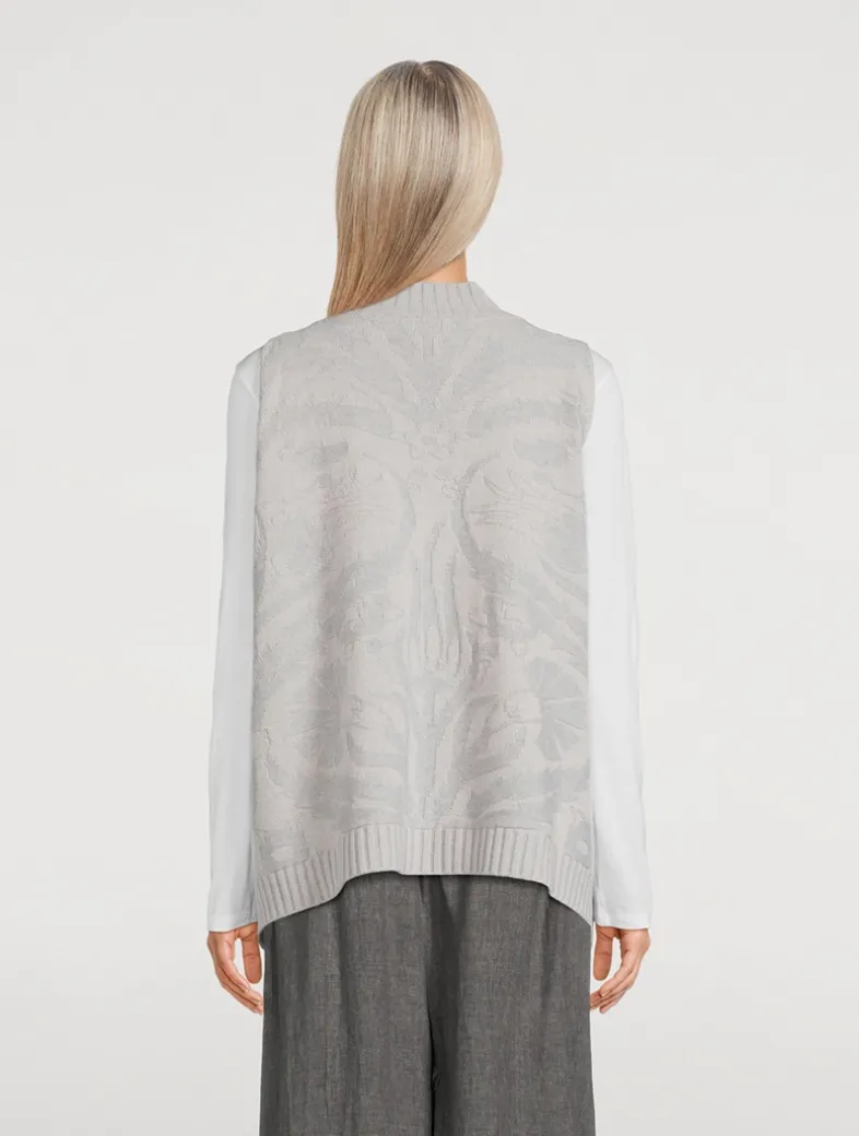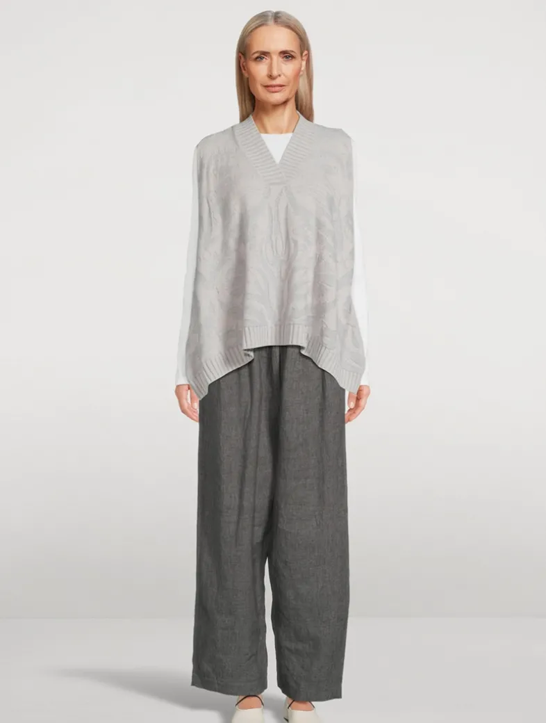 This sleeveless pullover is designed with a deep V-neckline and rib-knit trim. The cashmere vest is cut in a relaxed silhouette with a draped hem and allover carnation jacquard motif.
