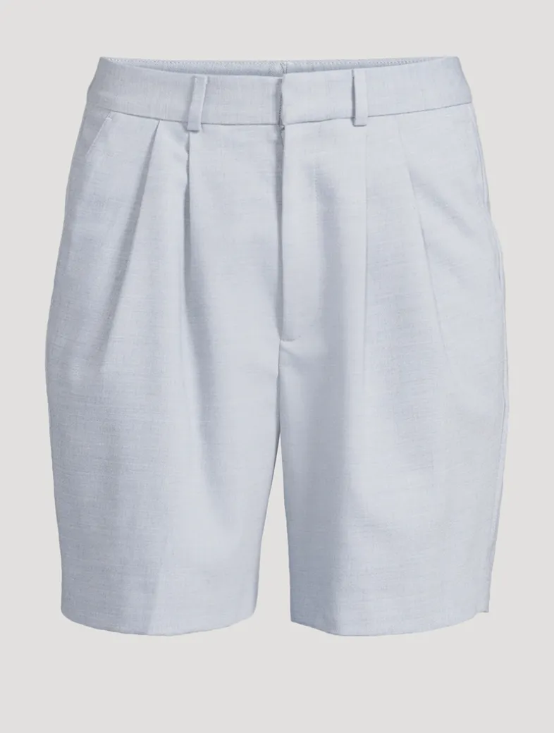 The Carrie Short is a pleated, trouser-inspired bottom constructed from a midweight, textured suiting fabrication. This tailored style is fully lined and features five functional belt loops, two back welt pockets, slanted front pockets, and a single button zip-front closure.