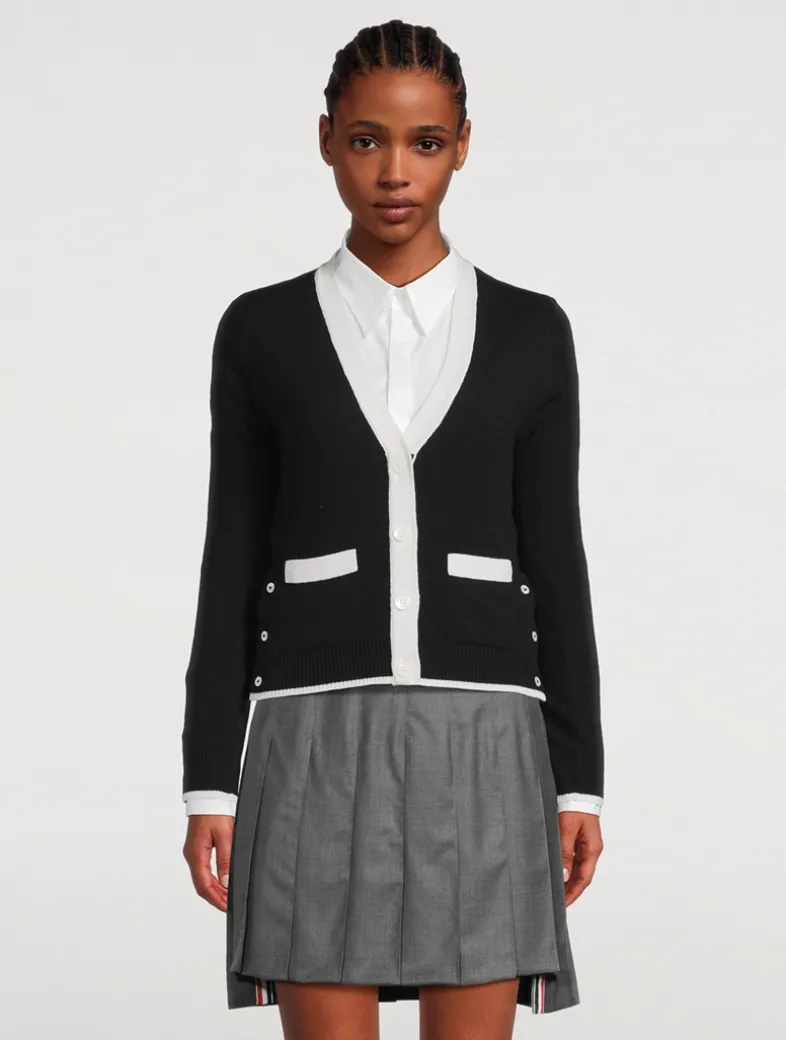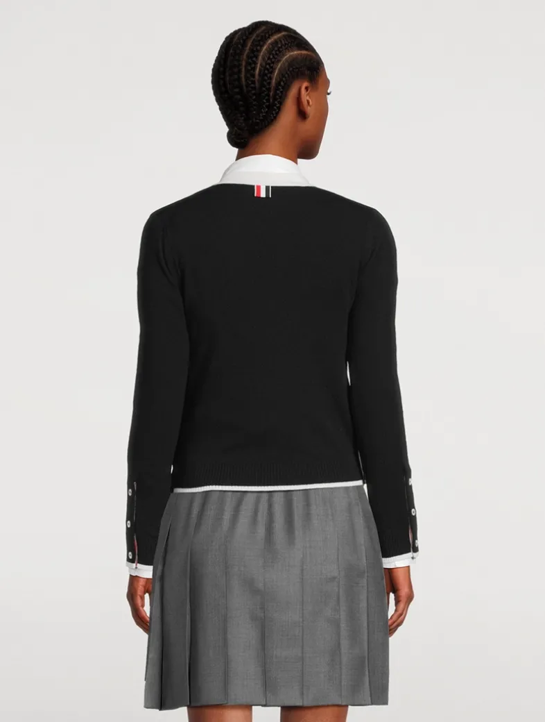 This luxurious cardigan exudes Thom Browne’s mastery of innovative design and tailored excellence. Knit from 100% cashmere, it is edged with contrast trim and finished with buttoned side vents and buttoned cuffs.