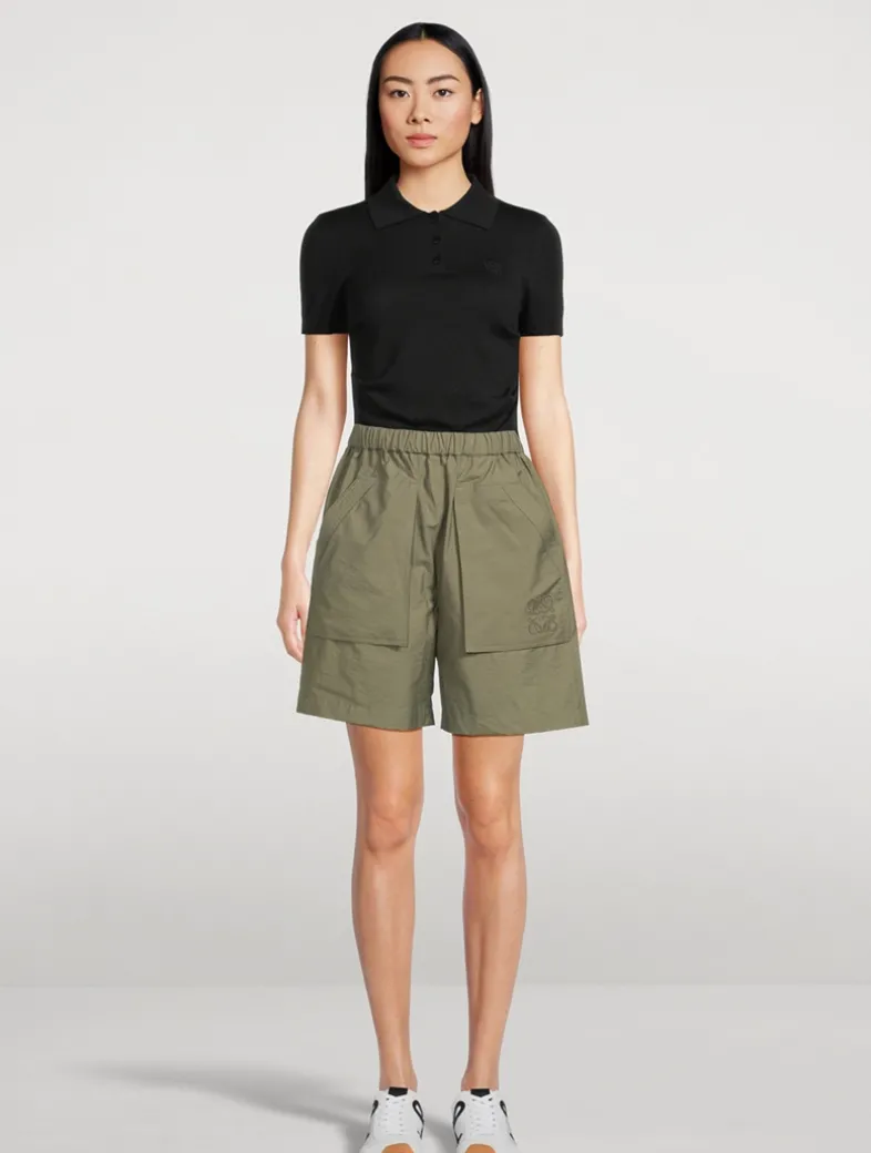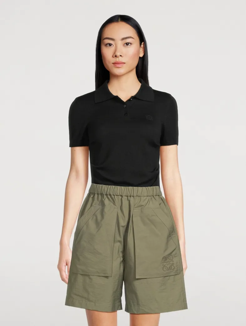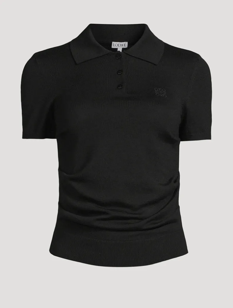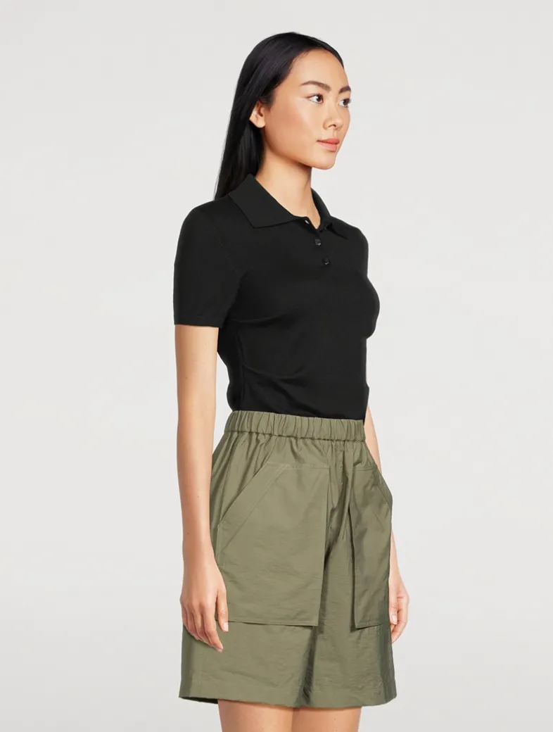 This short-sleeve sweater knit in an ultra-lightweight mix of cashmere and silk features a polo collar and gathered details at the sides.
