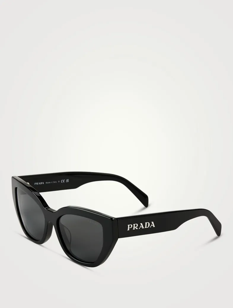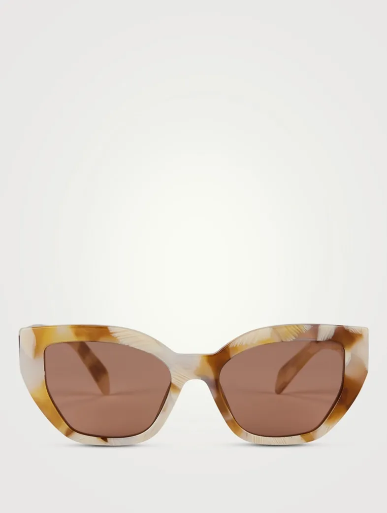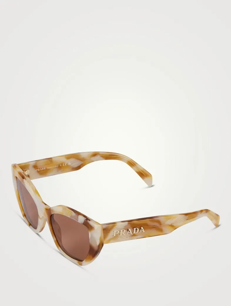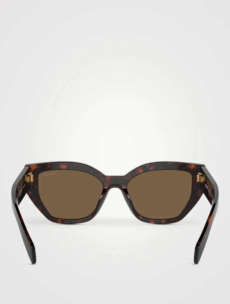Acetate sunglasses with a feminine cat eye design. The front with geometric rims is paired with chunky temples decorated with the Prada lettering logo.