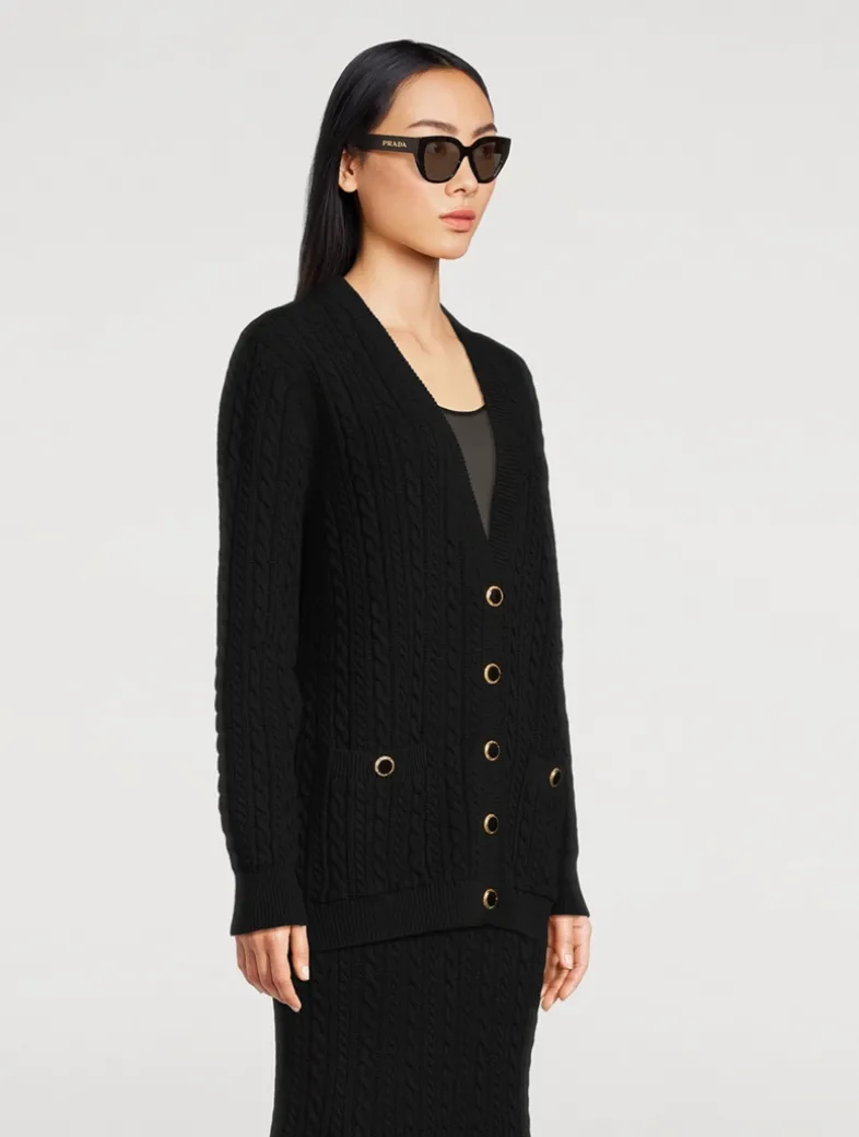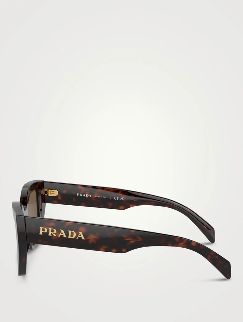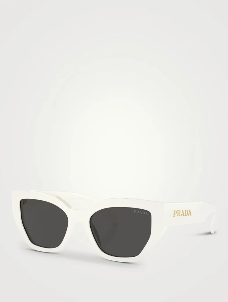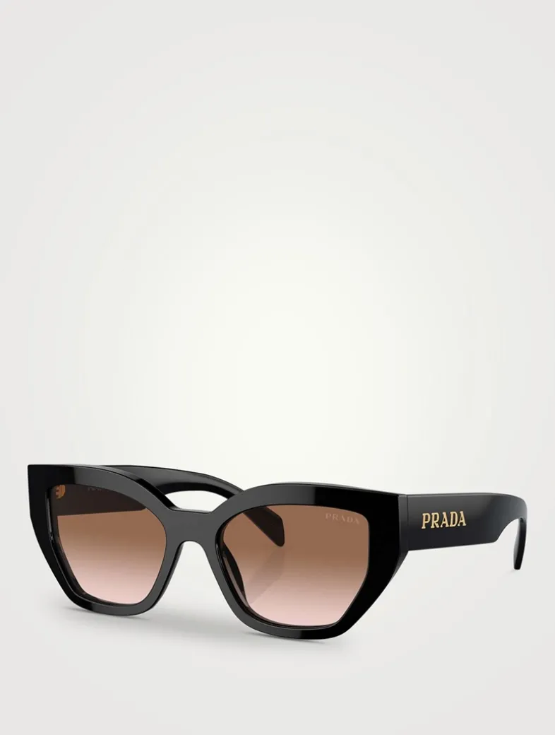 Acetate sunglasses with a feminine cat eye design. The front with geometric rims is paired with chunky temples decorated with the Prada lettering logo.