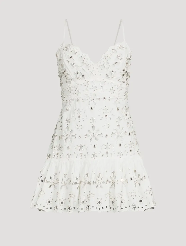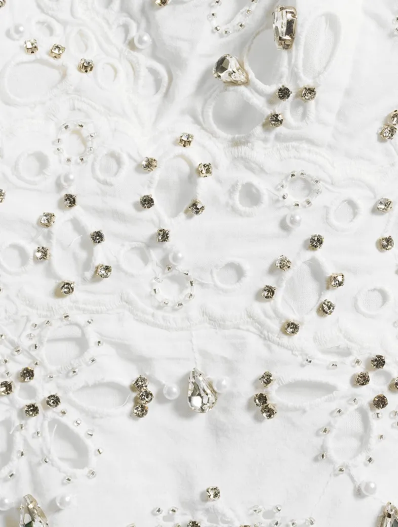 This stunning, fit-to-flare piece stuns with an arrangement of delicate eyelet details and is finished with teardrop-shaped beading all over for extra shimmer and an elevated look. Crafted from cotton and finished with adjustable straps that crisscross at the back.