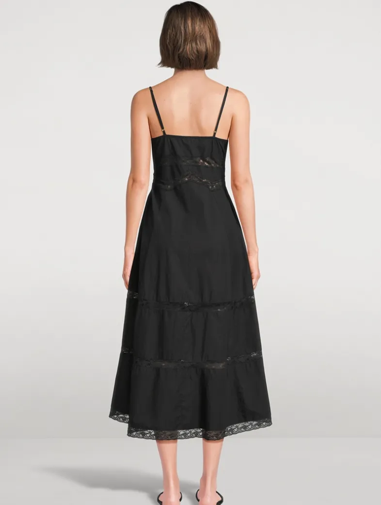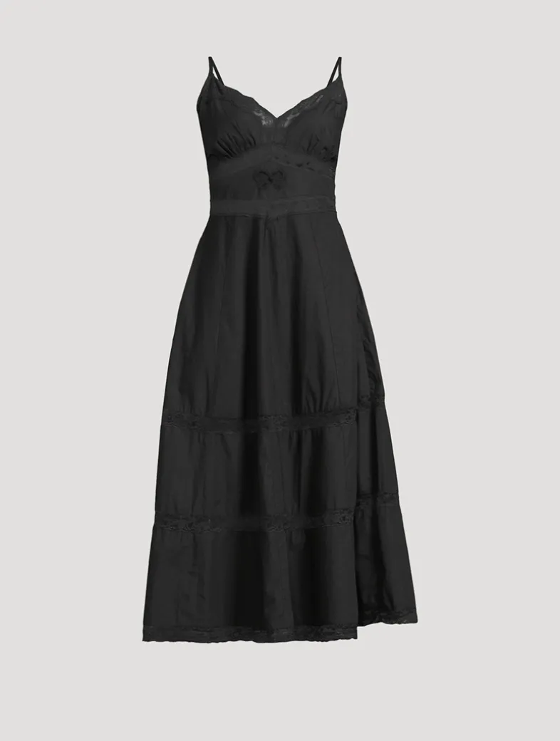 Cut from crisp, cotton poplin, inset with intricate lace at the body, neck, and the full A-line skirt, this fit-and-flare dress features a structural bodice for a flattering silhouette. A lace bow detail sits at the centre front alongside thin spaghetti straps, a scoop neckline, and an airy, sweeping skirt.