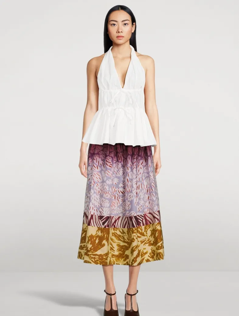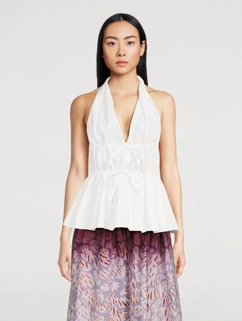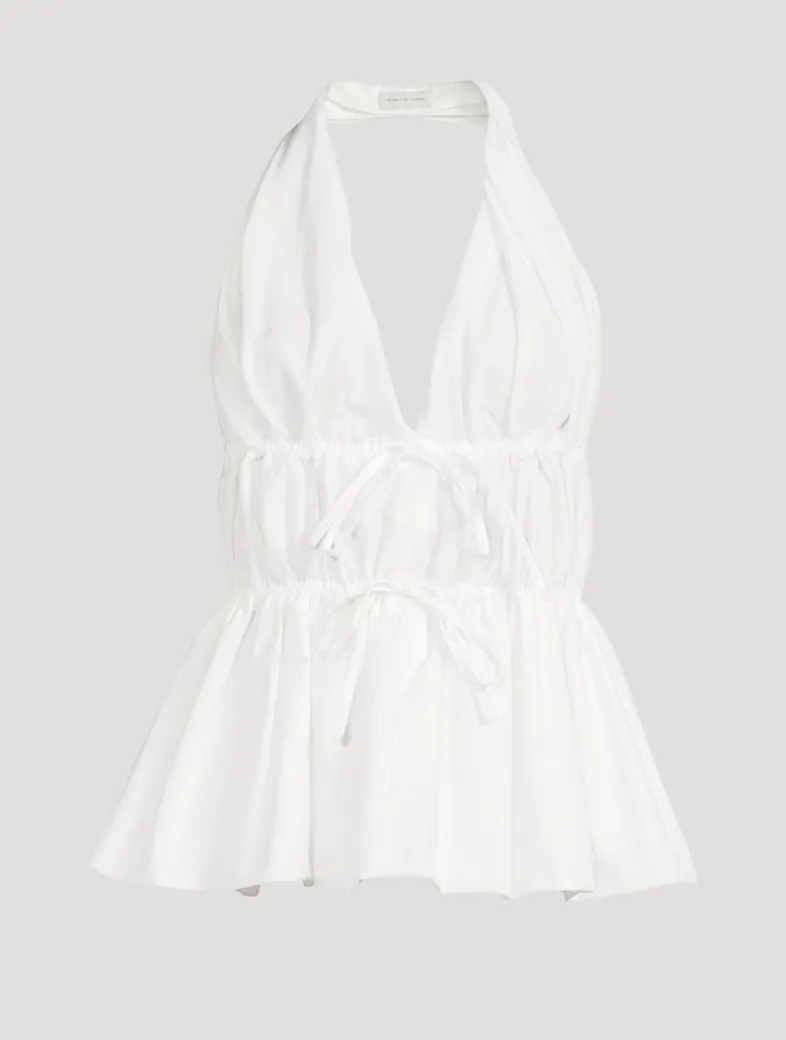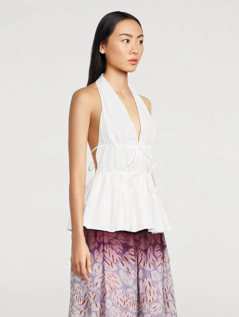 A boho take on a vintage-inspired style, this halter top is crafted from crisp cotton-blend poplin with ruching and delicate ties at the waist and open back. Finished with a plunging neckline and flared hem.