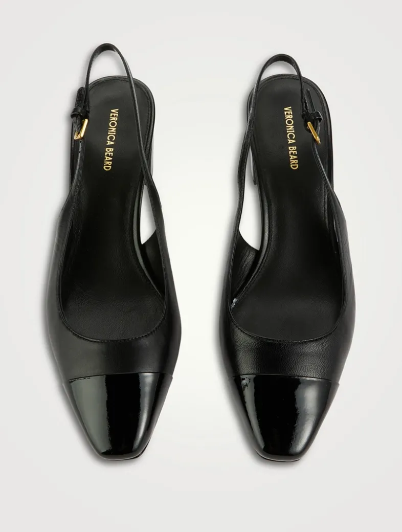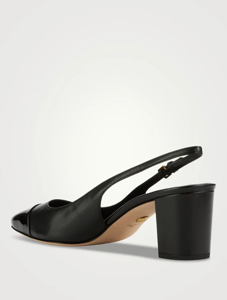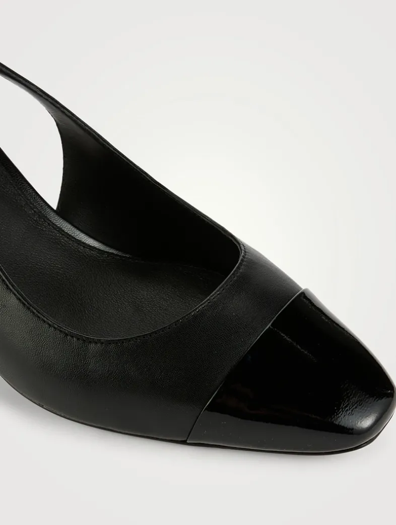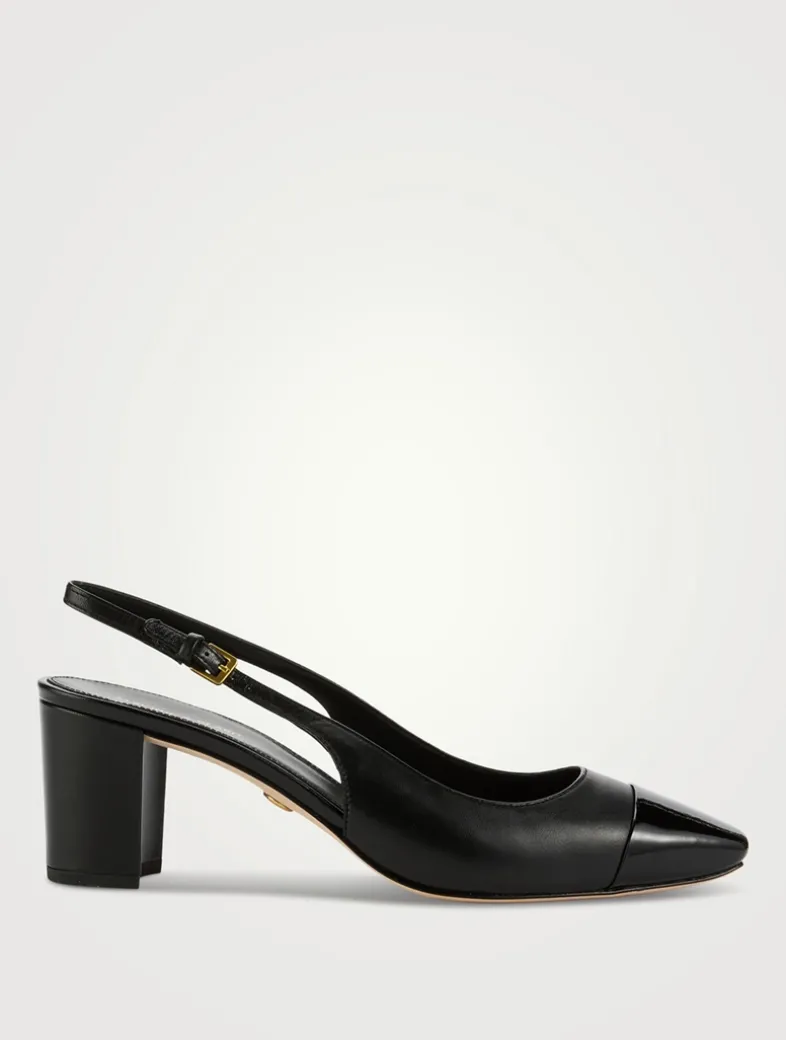 Meet the Cecile, a take on the classic cap-toe slingback with a mid heel. Expertly crafted from supple leather, this style features a tapered patent leather square toe, a 2.5