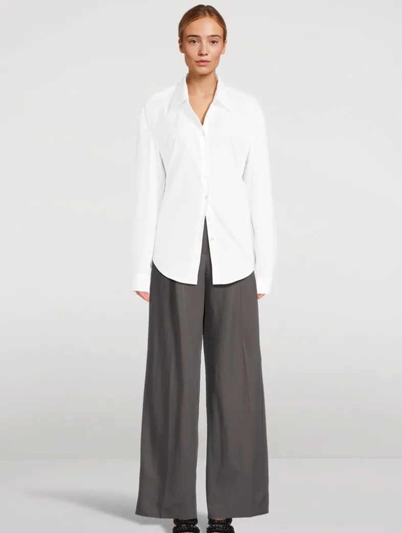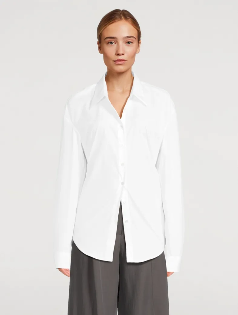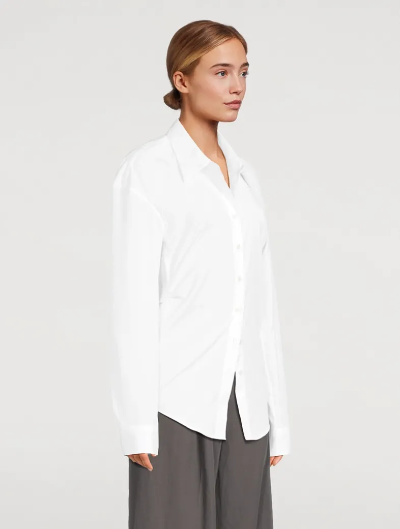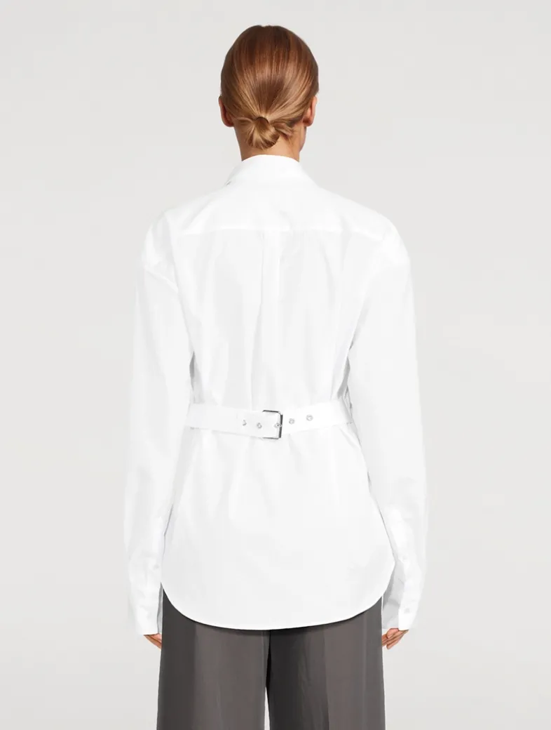 An update to the classic cotton poplin shirt, this version has a belted detail at the back that can be adjusted to nip-in the silhouette or it can be loosened to relaxed the shape.