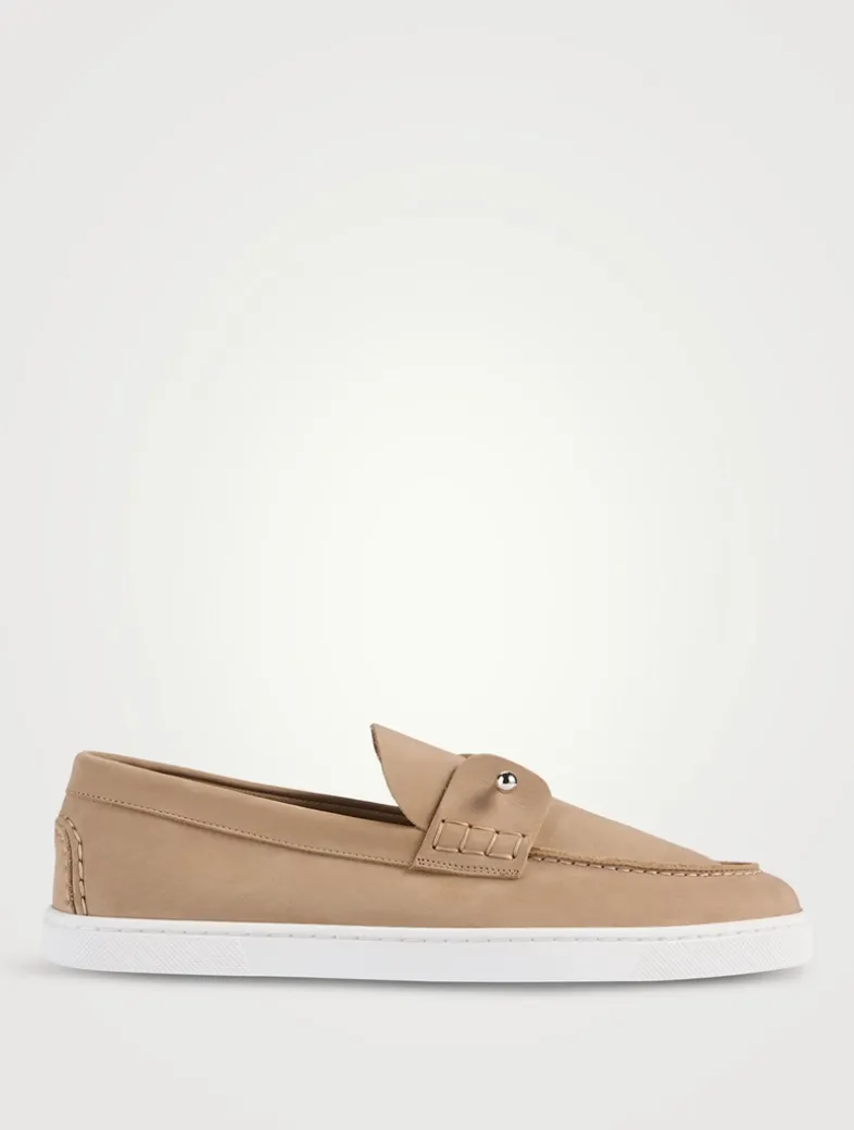 The Chambeliboat loafer features a sleek silhouette and supple structure. This refined model is entirely crafted in nubuck leather. Showcasing Maison Christian Louboutin’s creativity, it features a metal collar pin through the tongue.