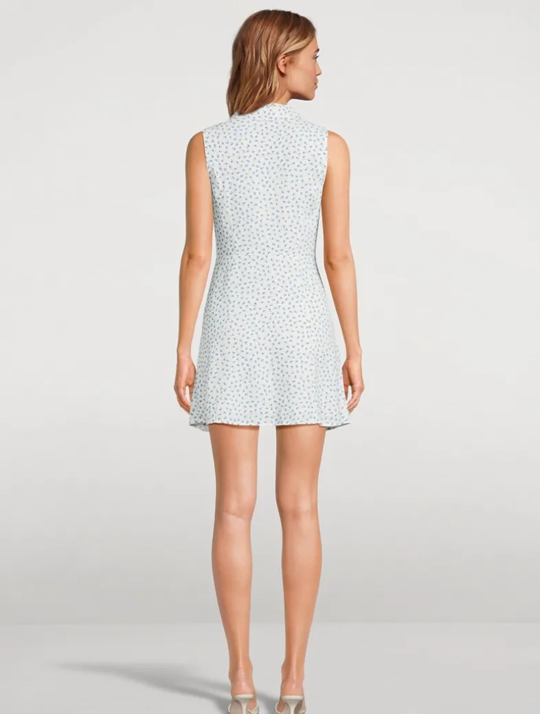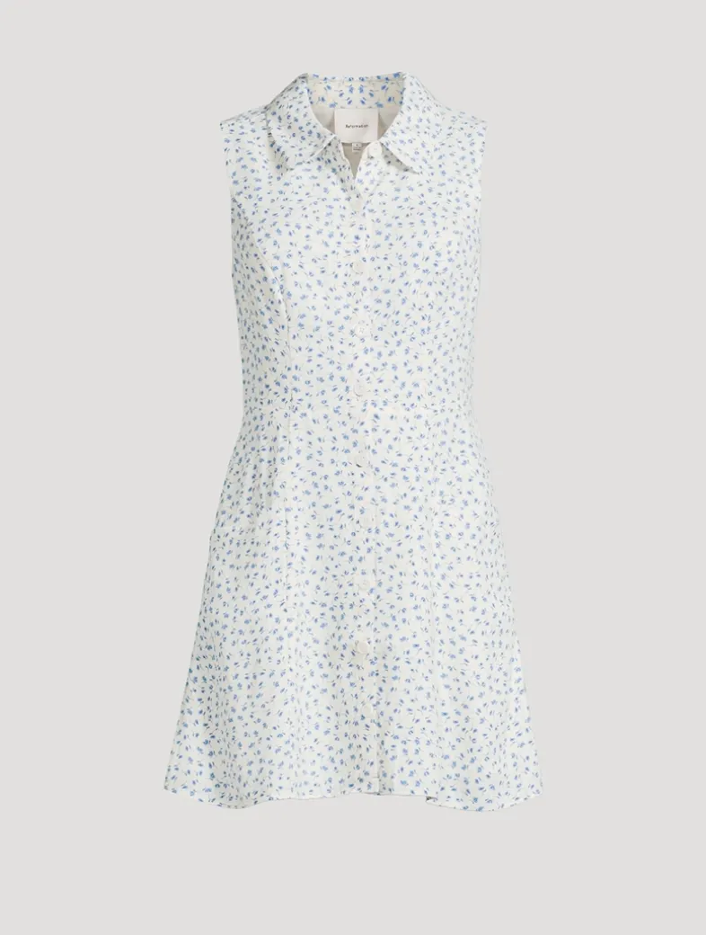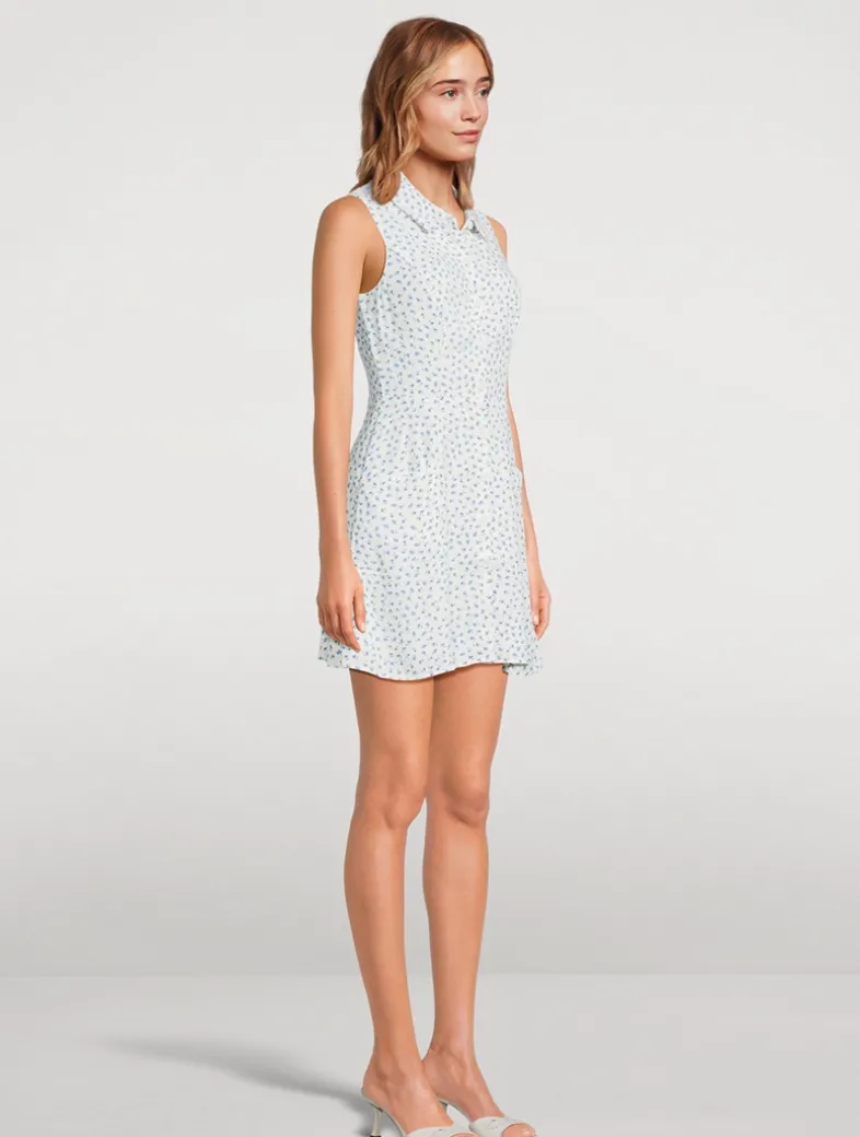 Tailored along a slim-fit bodice, this sleeveless shirt dress has a pointed collar and a flippy mini skirt. Made from a lightweight drapey crêpe fabric with a dry hand feel and a dainty floral print.