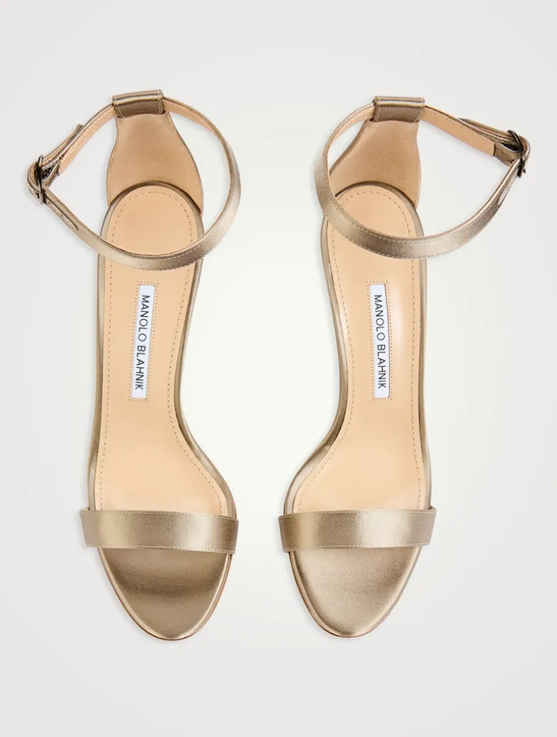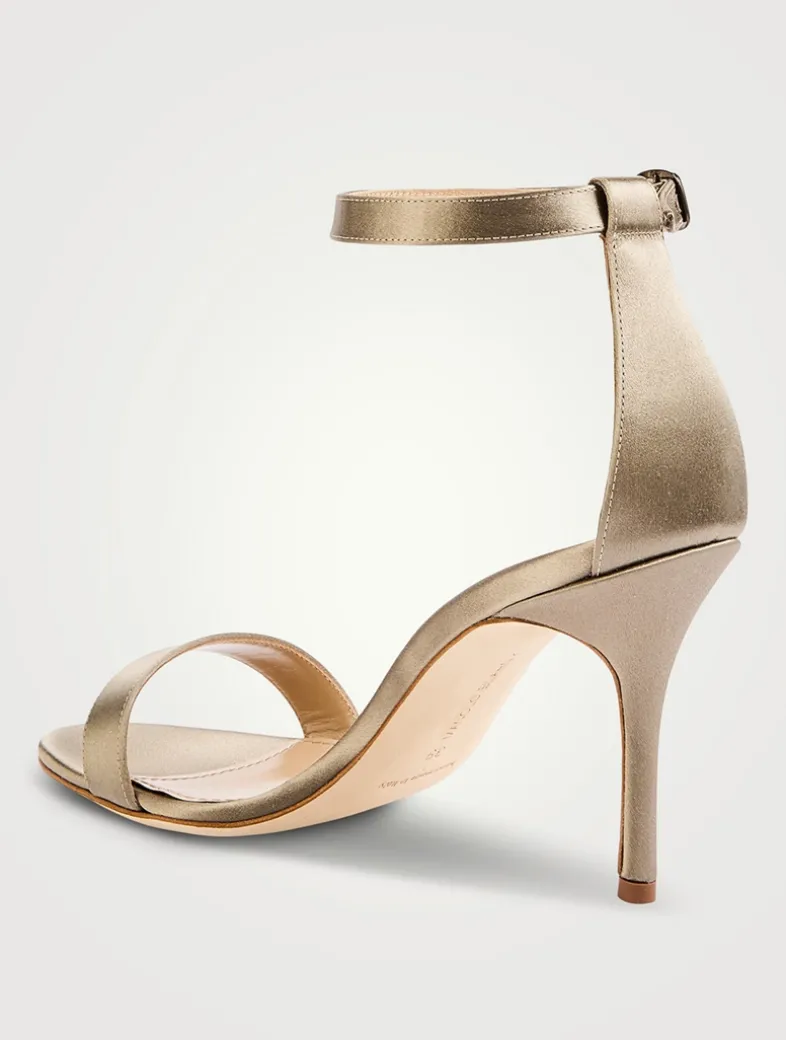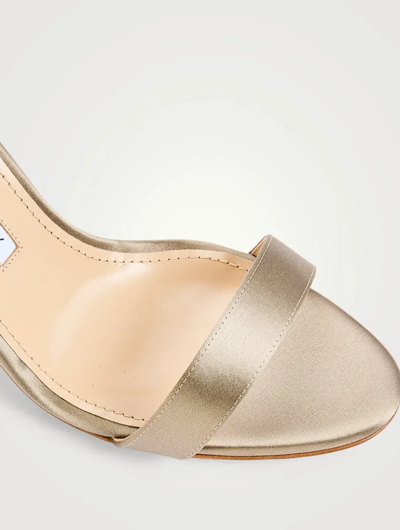 Crafted from a glossy satin, these open-toe sandals feature a slim ankle strap with buckled closure and a high stiletto heel.