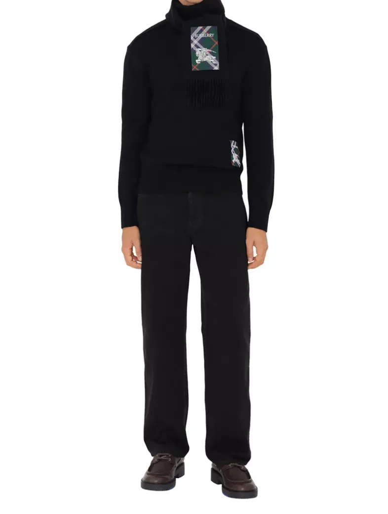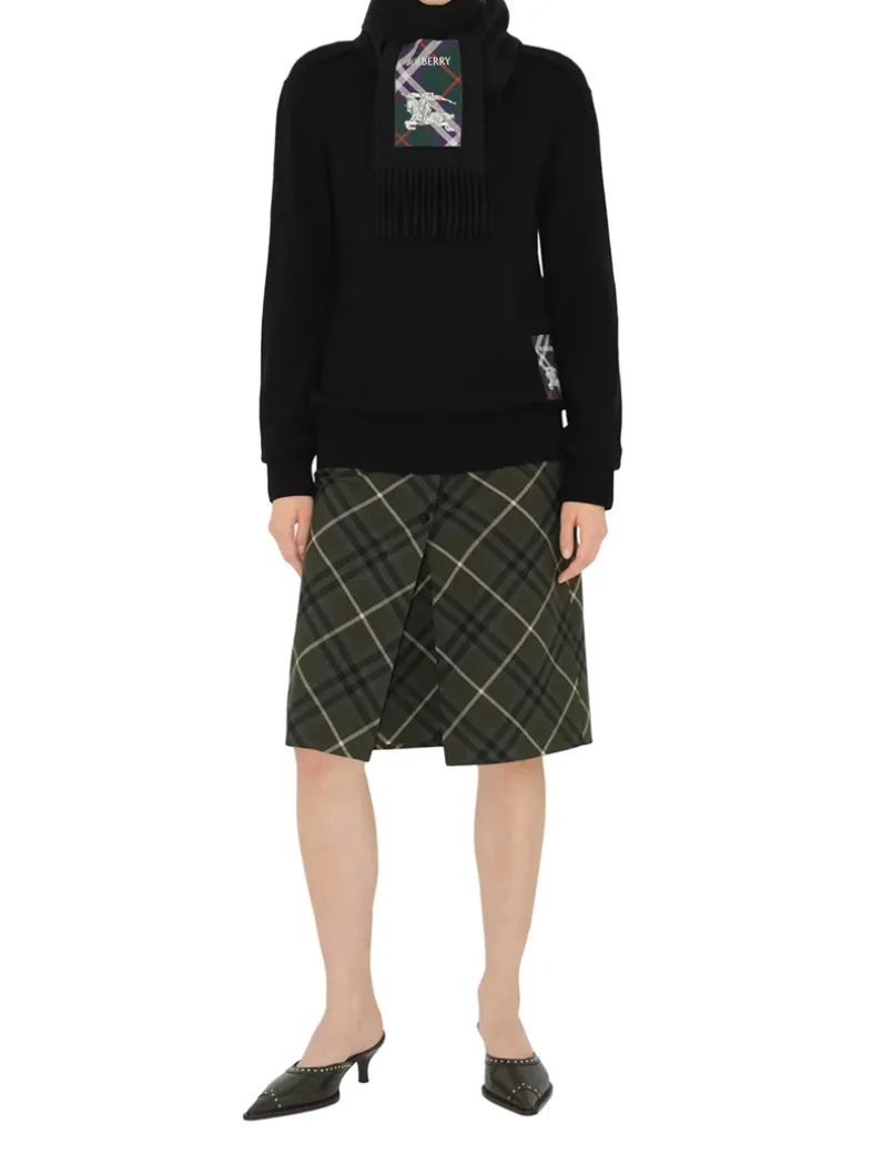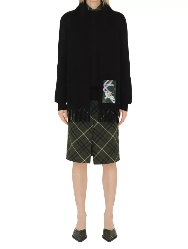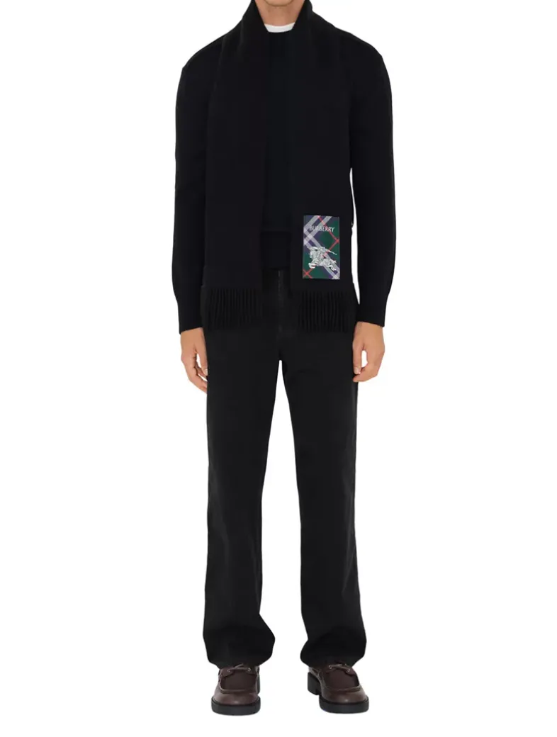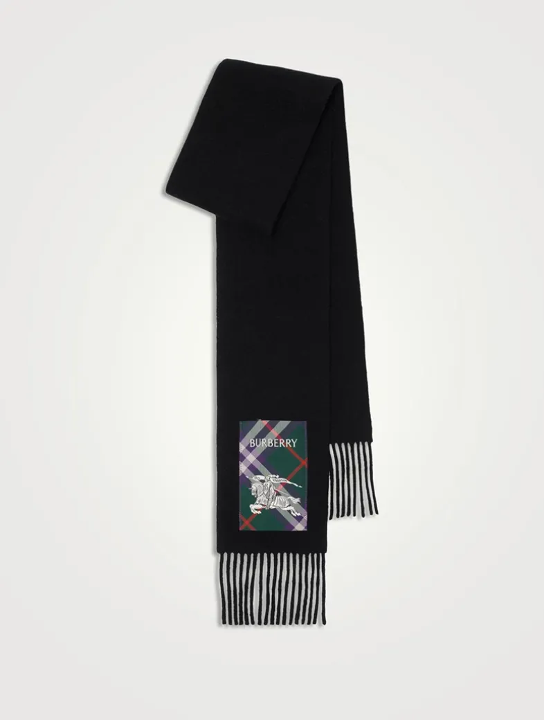 A cashmere scarf woven on traditional looms at a 200-year-old Scottish mill. The fabric is washed in local spring water and receives two further washes for an ultra-soft finish and raised nap. Reworking the label from our signature trench coats, the style features an appliquéd patch woven with the Burberry Check, logo and Equestrian Knight Design.