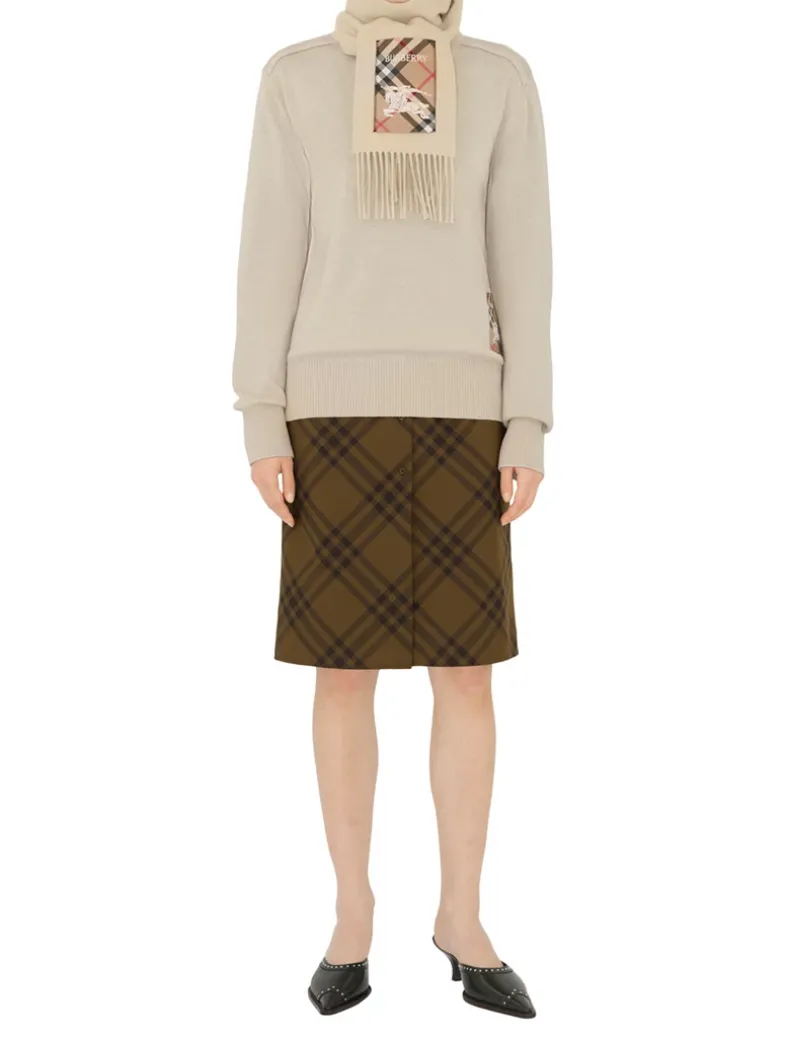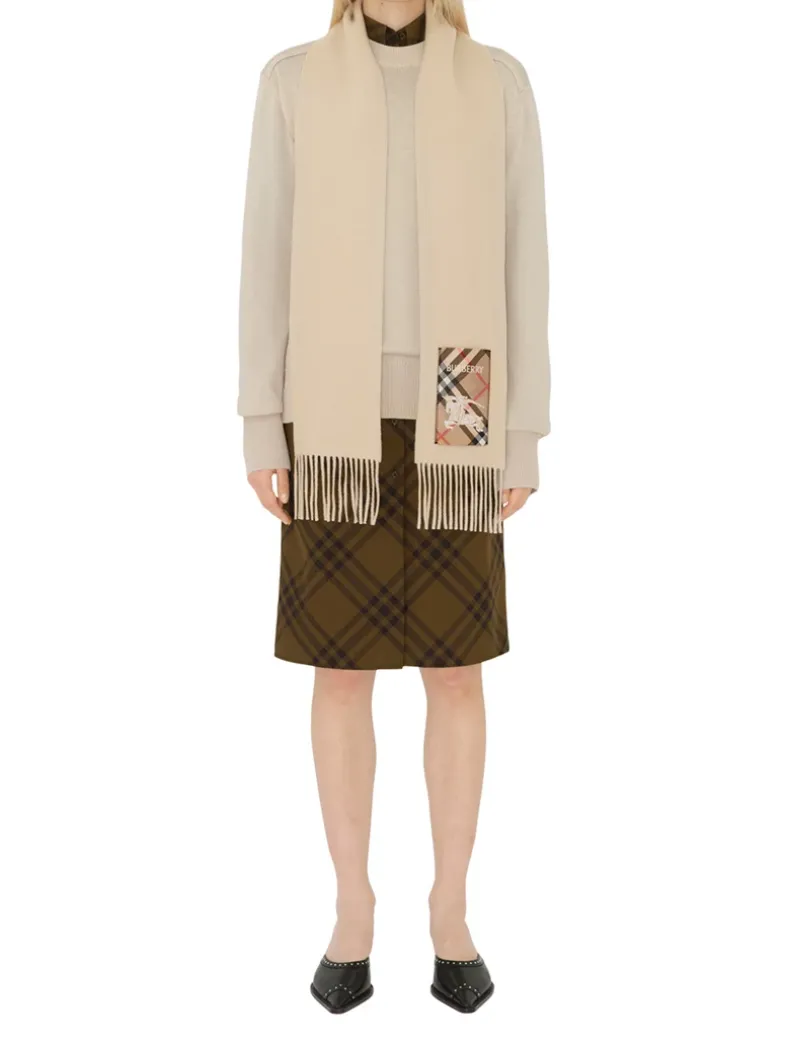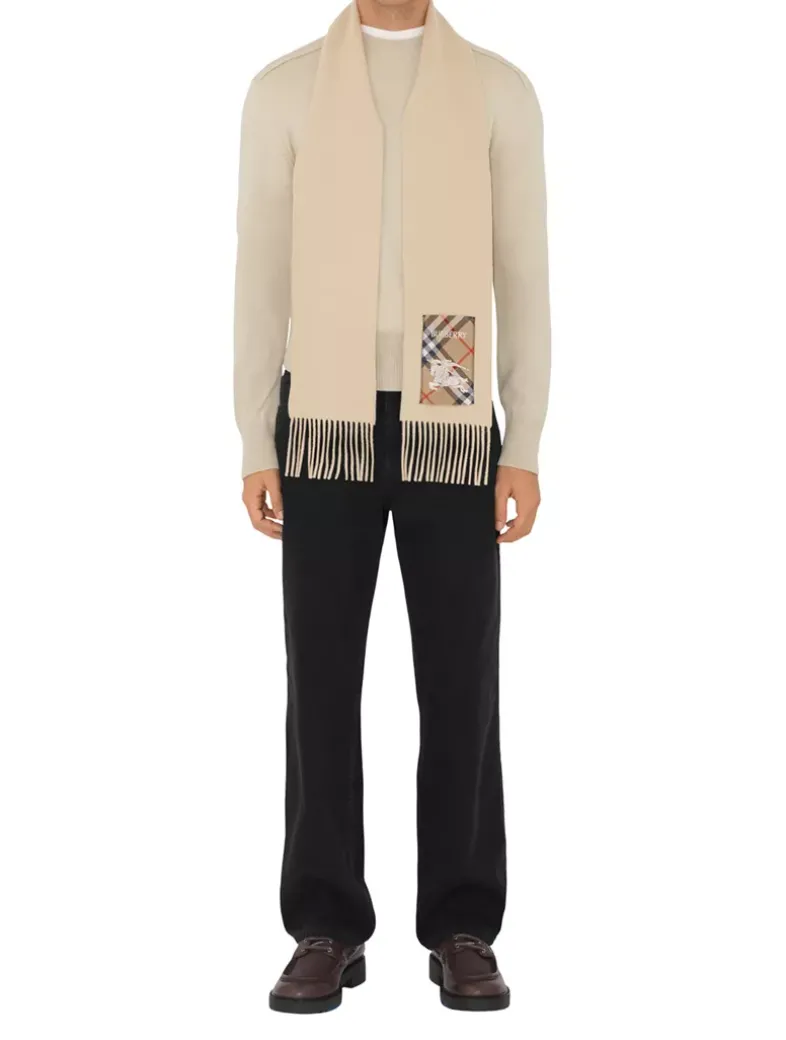A cashmere scarf woven on traditional looms at a 200-year-old Scottish mill. The fabric is washed in local spring water and receives two further washes for an ultra-soft finish and raised nap. Reworking the label from our signature trench coats, the style features an appliquéd patch woven with the Burberry Check, logo and Equestrian Knight Design.
