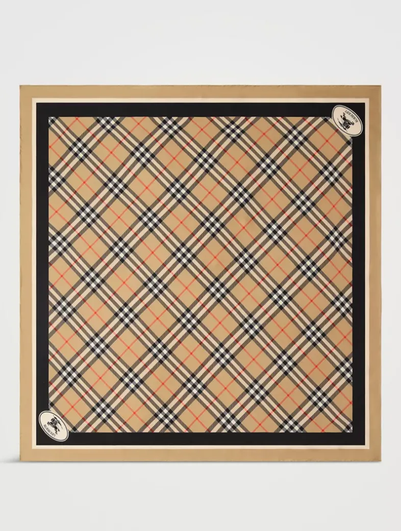 A square scarf made in Italy from silk twill, printed with the Burberry Check. The design is framed with contrasting stripes and our Knight stamp, an archival motif first seen on Burberry bags in the 1980s.