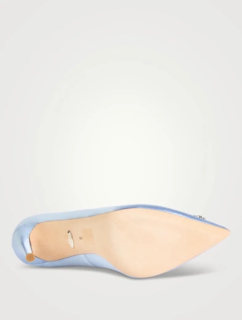 A dazzling crystal-embellished brooch highlights the toe of these pumps. Crafted from a glossy satin, they are set on a high heel.