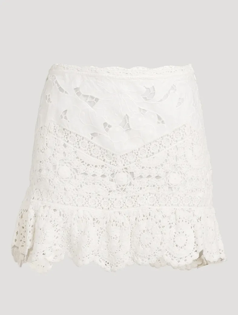 This bohemian mini is crafted from a mix of floral-embroidered cotton and delicate crochet lacework. Cut to a slim silhouette with a ruffled hem.