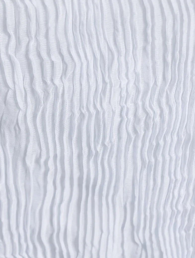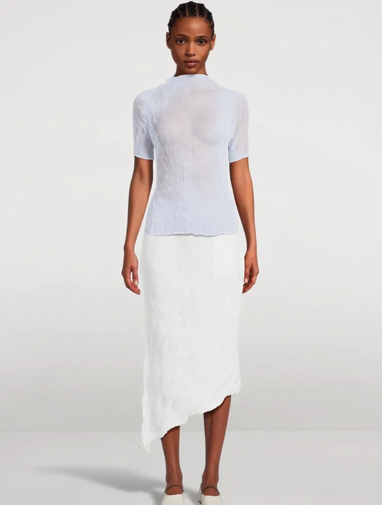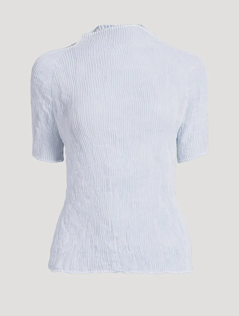 Made from recycled polyester, Chiffon Twist 3 tops are characterised by their sheer finish and fine hand pleating. They are offered in seasonal colours for versatile coordination and layering. This pleated top has a slim fit, short sleeves, and a mock neckline.