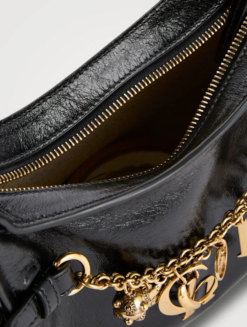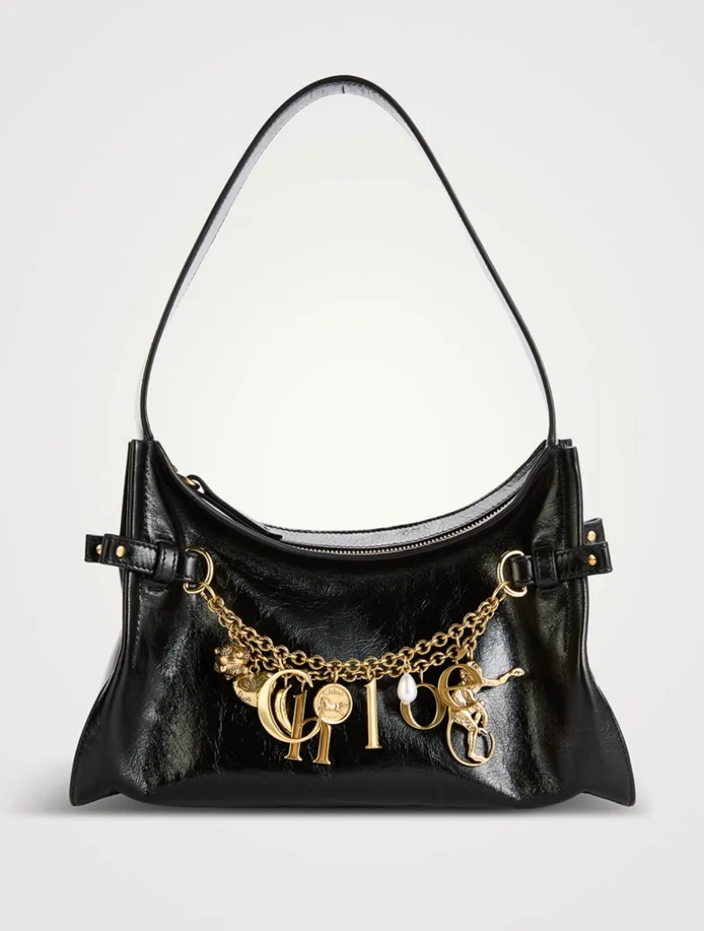 Crafted from shiny calfskin, this Chloé Charms bag has a supple silhouette with curved and sharp lines. A gold-tone double chain adorns the front, embellished with dangling pendants and the Chloé letters in a nod to the Maison’s heritage.