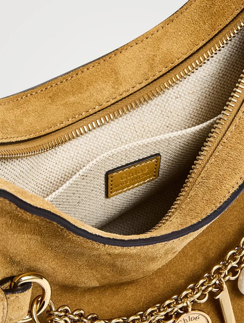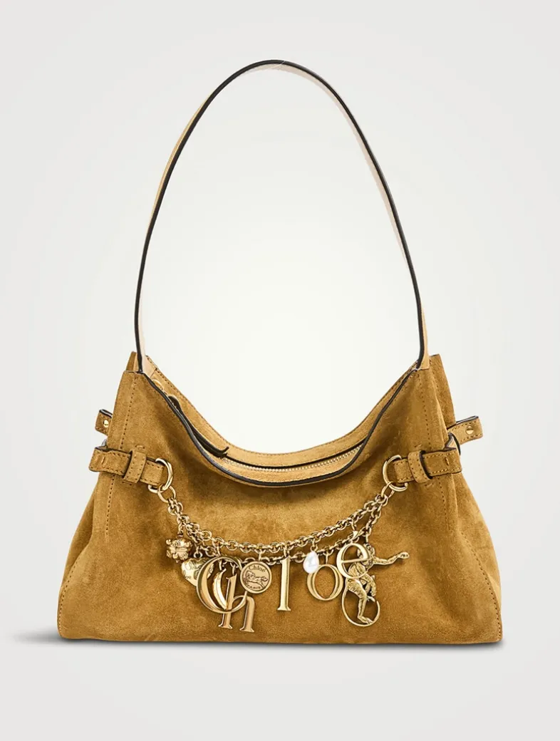 Crafted from soft suede, this Chloé Charms bag has a supple silhouette with curved and sharp lines. A gold-tone double chain adorns the front, embellished with dangling pendants and the Chloé letters in a nod to the Maison’s heritage.