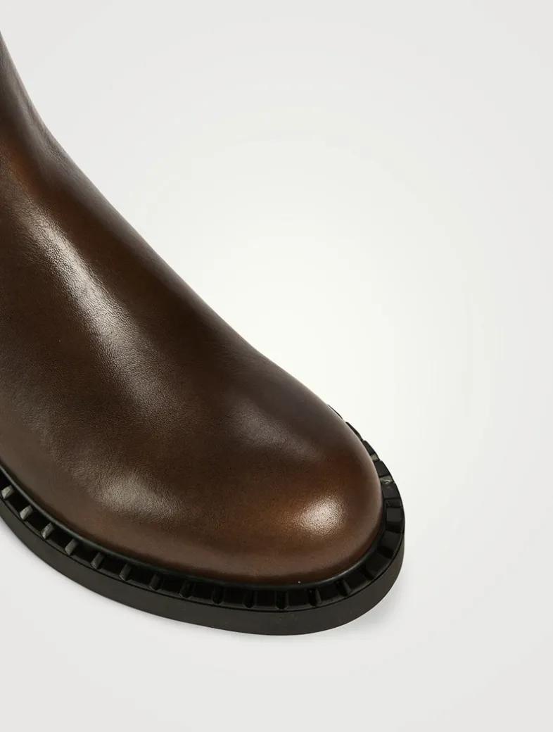 These chocolate leather ankle boots are defined by the elasticized side gusset and enamelled metal triangle logo that stands out on the upper.