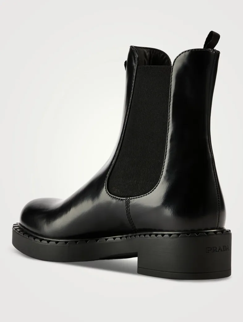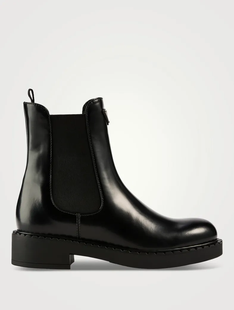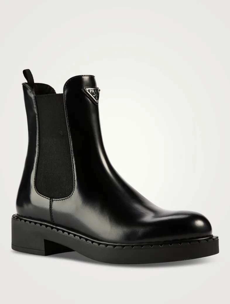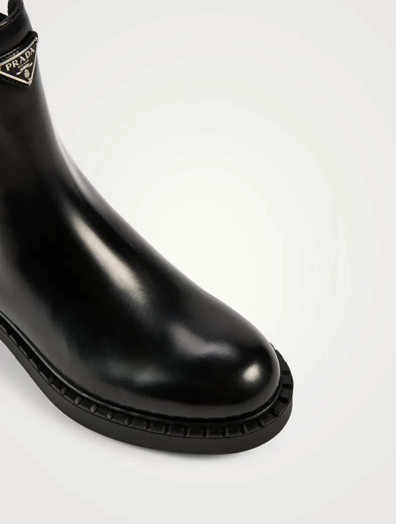 These chocolate leather ankle boots are defined by the elasticized side gusset and enamelled metal triangle logo that stands out on the upper.