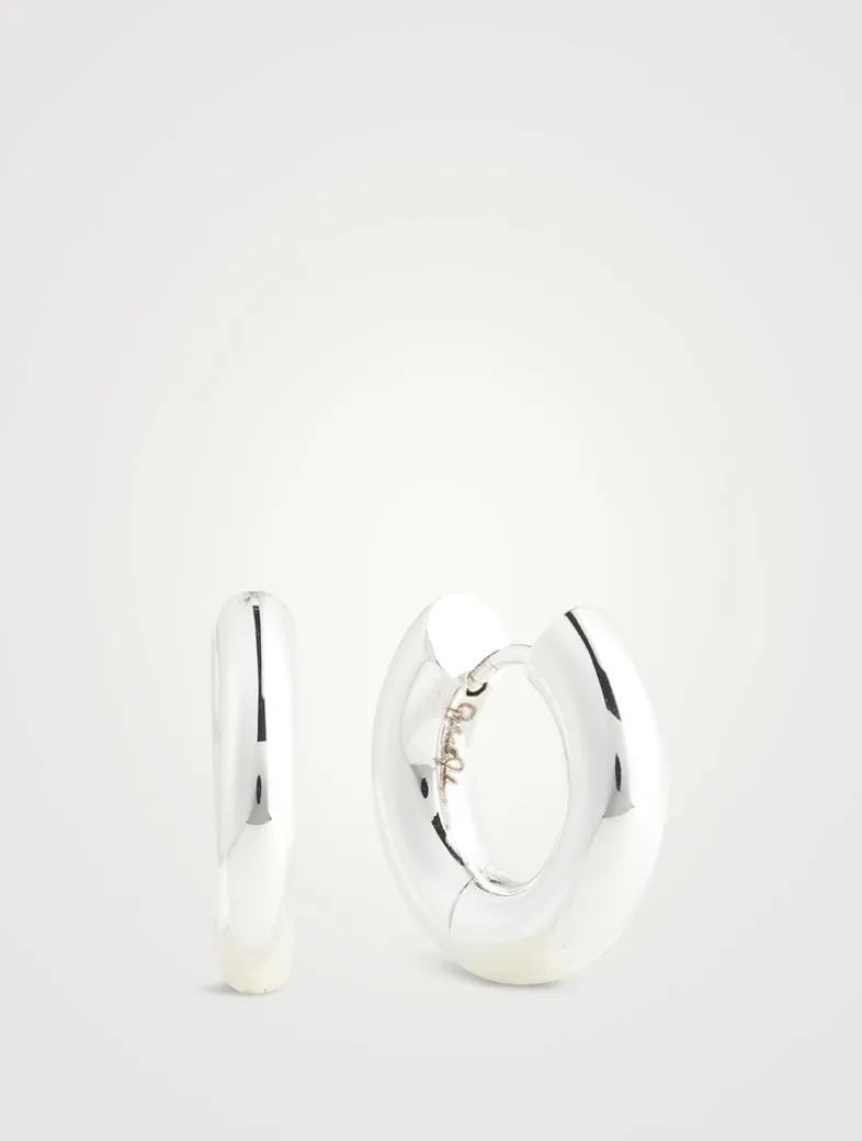 The signature Jules hoop is a pair of silver chunky hoop earrings designed with a modern snap closure. These earrings are compatible with most MADEMOISELLE JULES charms.