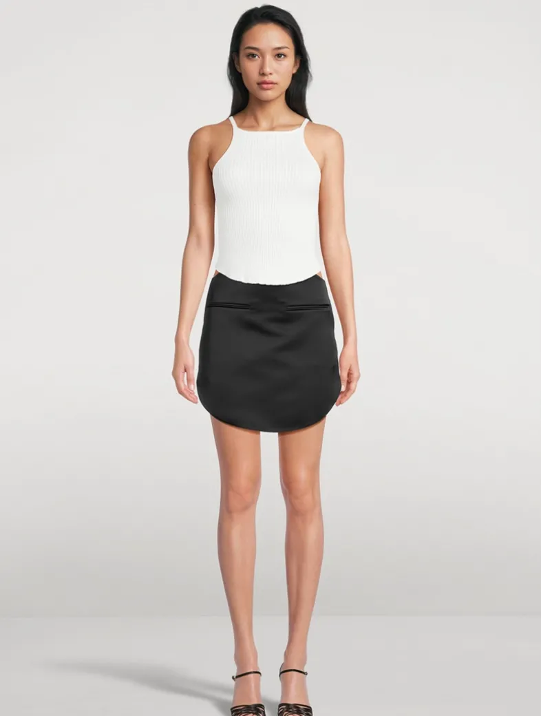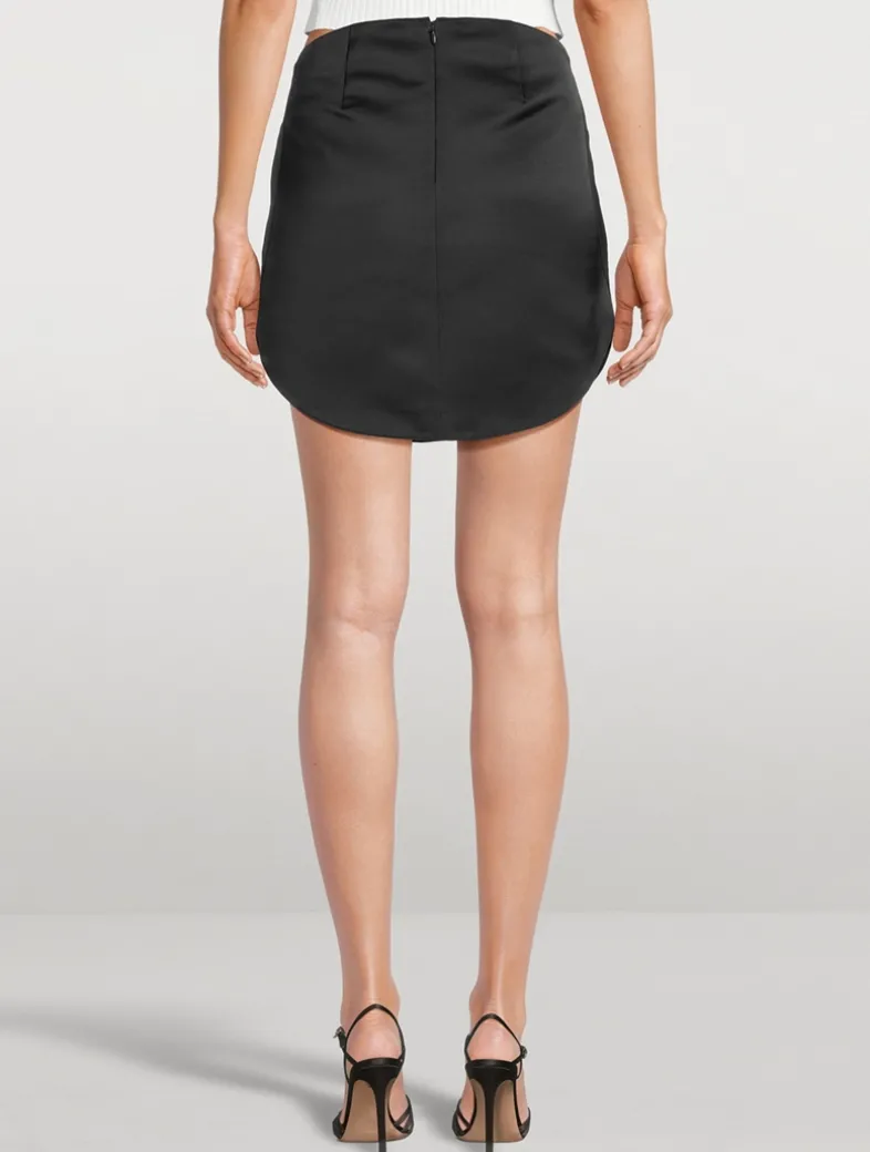 Designed with a circular front, this glossy satin mini skirt has two front welt pockets and a back zip closure.