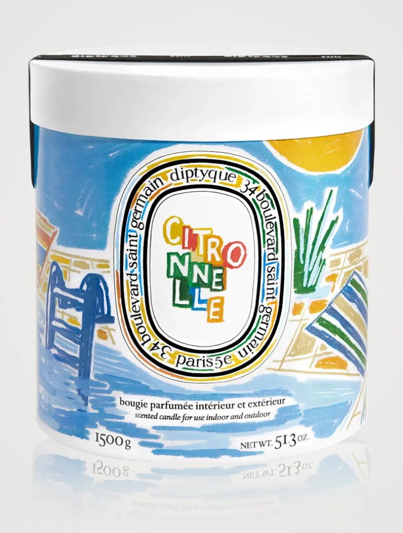 Bright, zesty lemongrass fills the summer night with aromatic magic. When the sun dips below the horizon, the air cools. This five-wick scented candle can be used indoors and outside. Handmade and sheathed in a clay pot complete with a label illustrated by artist Alexandre Benjamin Navet.