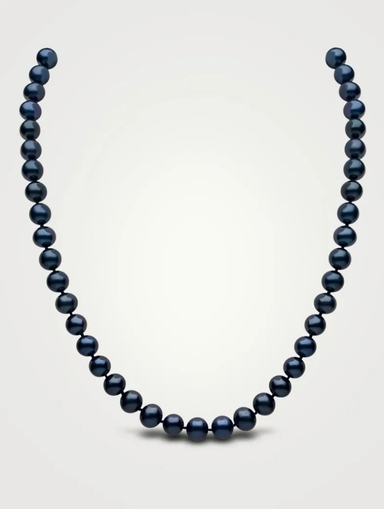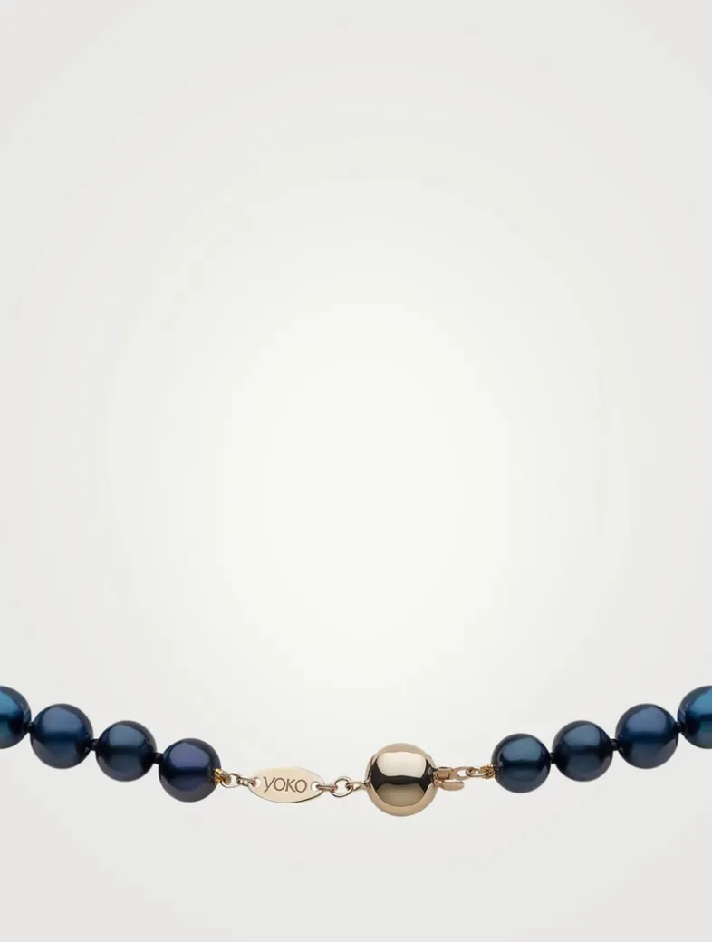 This elegant necklace is designed with treated black freshwater pearls, and finished with an 18kt yellow gold ball clasp.