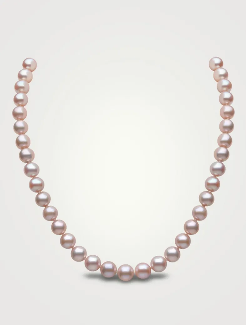 This elegant necklace is designed with natural colour pink freshwater pearls, and finished with an 18kt yellow gold ball clasp.